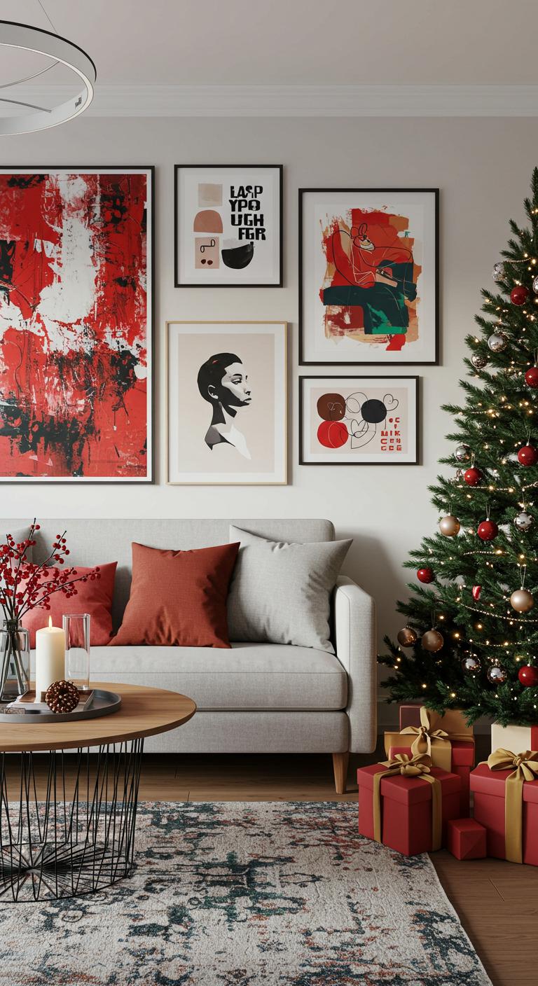 While holiday decor often leans towards traditional ornaments, incorporating statement wall art can elevate your modern living room into a vibrant holiday haven.