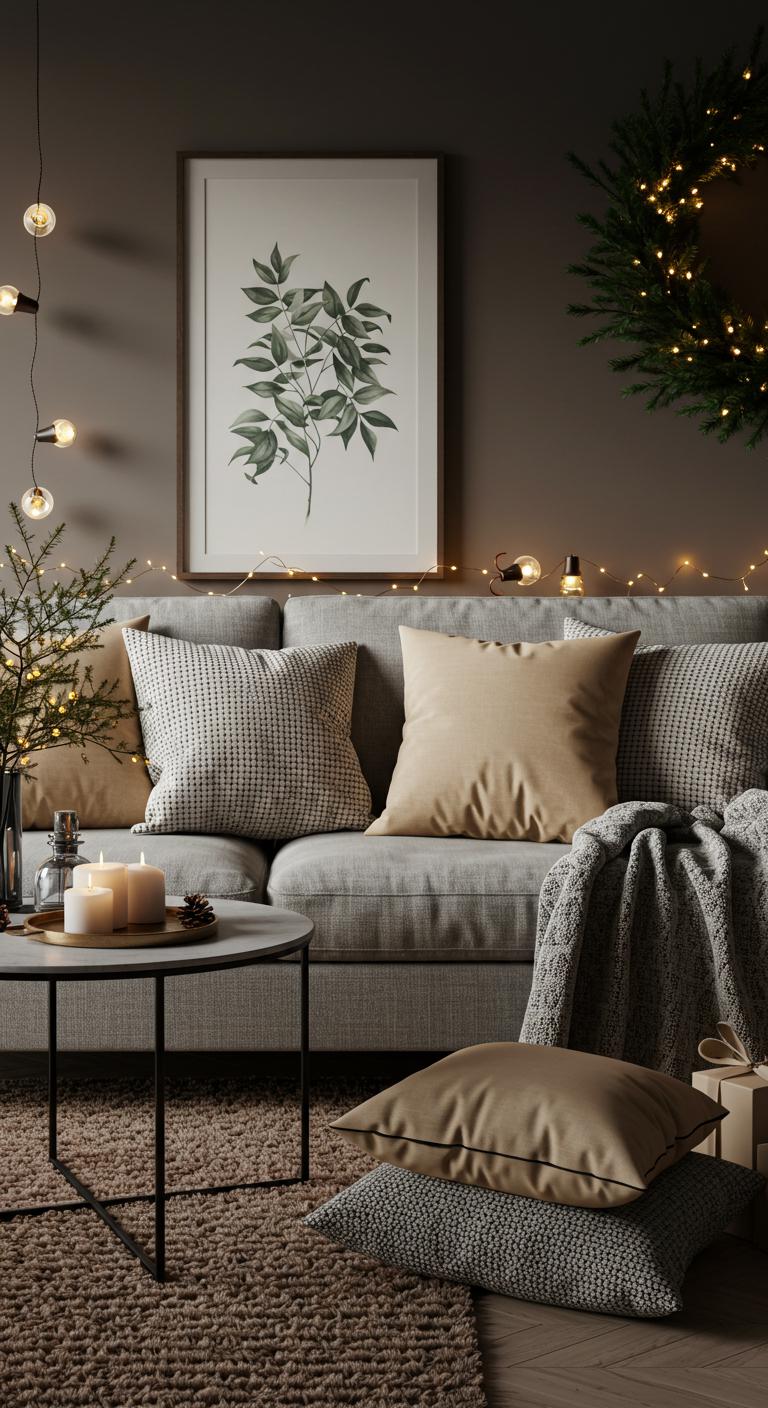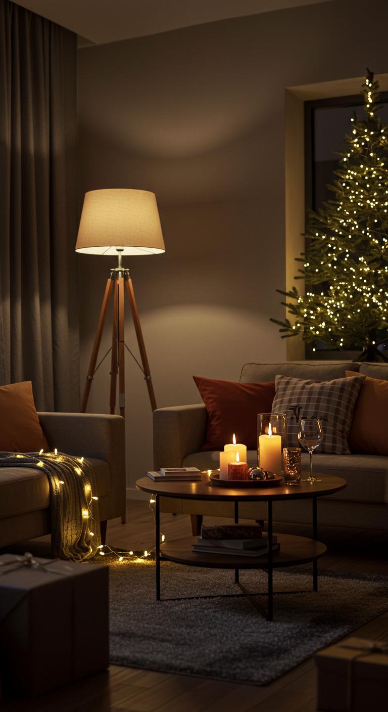 There’s something magical about how layered lighting can transform your modern living room into a cozy holiday haven.