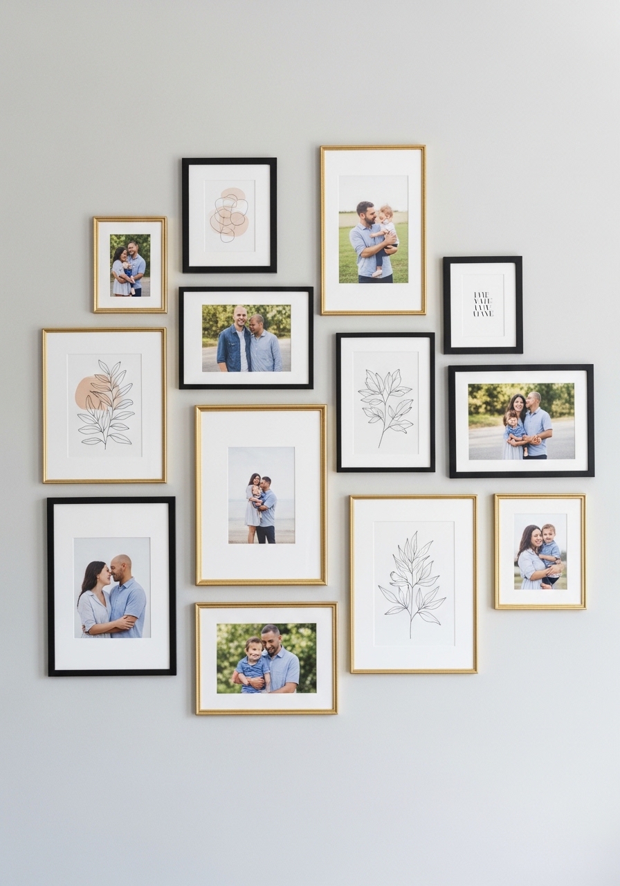I thrifted frames and bought fresh white mats to standardize the look. Mixing warm brass and black frames keeps things modern. Keep spacing consistent—about 2 inches. Avoid matching every frame; that creates a flat, catalog look.