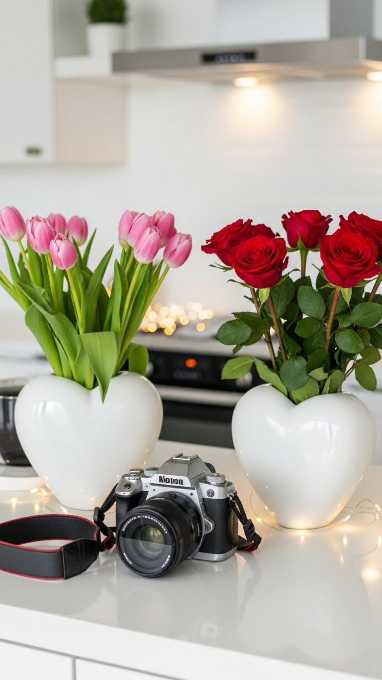 Grab a heart-shaped vase from your local store—under $5 if you shop smart. Place it on your counter with a few fresh roses or tulips for instant charm. Start by filling the vase halfway with water. Add the flowers and trim the stems to fit. This takes less than 10 minutes. Mix in wildflowers for a personal twist. If you’re on a budget, use fake blooms that last. They cost about $3 each and won’t wilt. Try a DIY: Tie a red ribbon around the vase for extra pop. Scatter a few petals around it. This creates a sweet focal point. Set it near your coffee maker for daily smiles. Friends will notice and ask how you did it so easily. Keep it simple—swap out for regular decor after the day. Your kitchen feels warmer right away.
