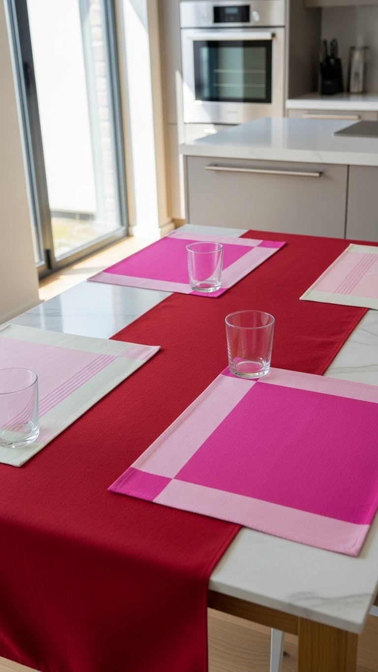 Pick red and pink items to set the tone. Start with a table runner in soft pink—find one for $10 online. Lay it across your kitchen table. Add red placemats underneath plates. This pulls everything together fast. Use what you have: Old napkins in these shades work fine. Arrange them with heart patterns for fun. Layer in accents like a pink cloth under a bowl of fruit. It costs nothing extra. For a DIY, mix fabric scraps to make your own runner. Cut and sew in minutes. Place it on your island for a cozy eat-in spot. The colors make the room feel alive. Clean up is quick—just roll it up. Your space looks put-together without much effort.