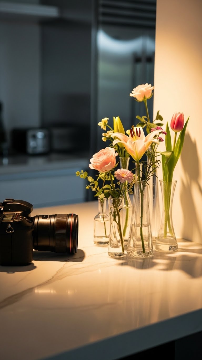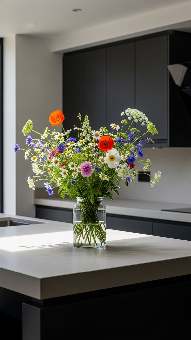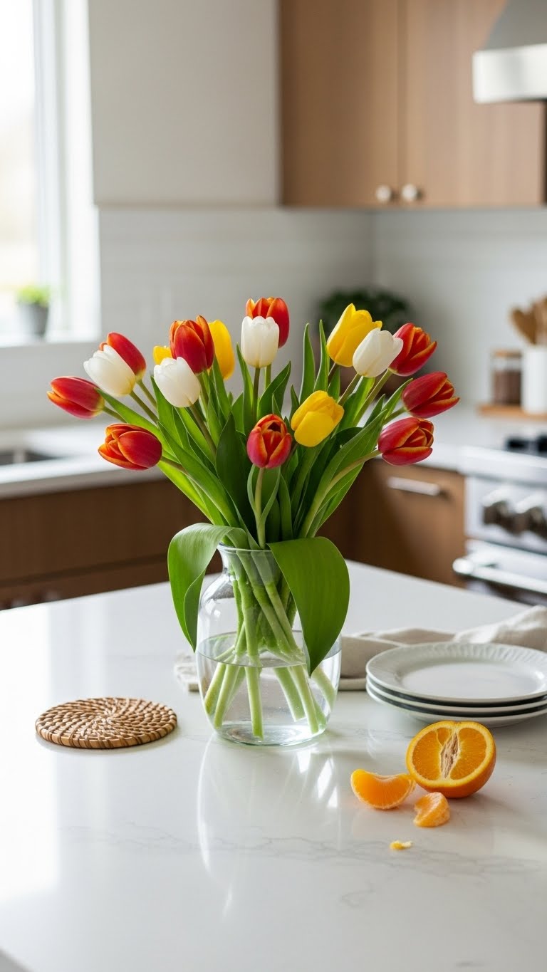 Buy a bunch of tulips for under $20 at the market. Put them in a bud vase on your counter. Snip the stems at an angle and add water. This keeps them perky for days. Choose wildflowers if roses feel too formal—they’re cheaper and add variety. Group a few vases together for a bigger impact. It takes five minutes to set up. For a DIY, use jars from your kitchen. Fill with water and pop in the flowers. Scatter them around your sink or stove. They bring a natural scent that makes cooking better. When they fade, compost them easily. Your kitchen gains a lively feel instantly.