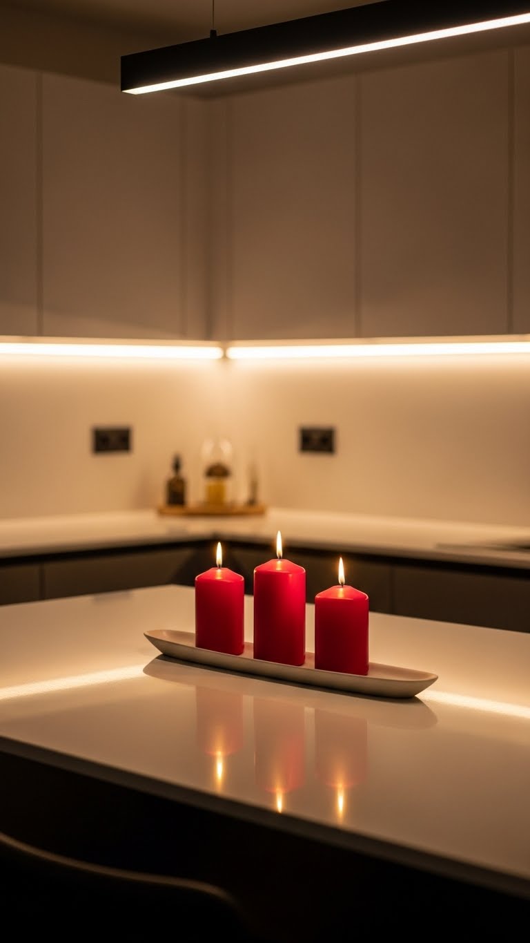 Light up your space with red candles—grab a set for $15. Place them on a tray in the center of your island. Use different heights for depth. Light them at dinner for a soft glow. Stack them simply to avoid clutter. If you have kids, swap for lanterns instead. They’re safer and cost about $10. For a DIY, wrap candles in pink ribbon. Set it up in seconds. Position near your dining area for romance. Blow them out after use. The effect makes meals special without extra work.