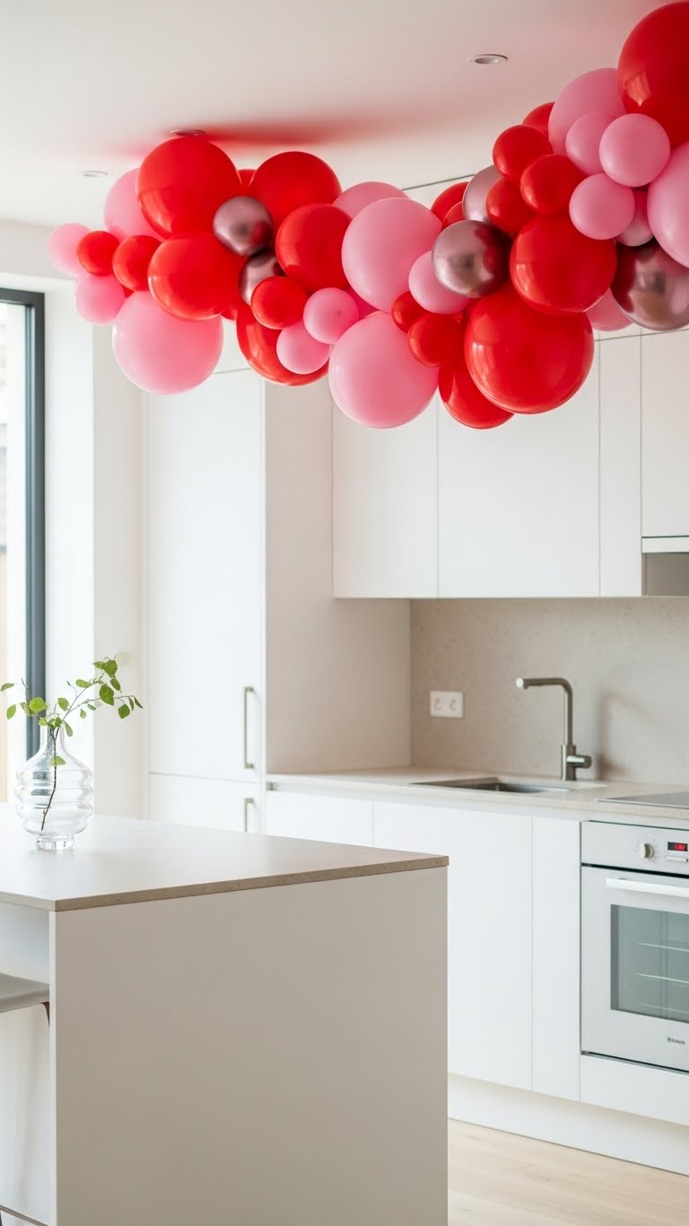 Blow up red and pink balloons—buy a pack for $5. Tie them into a garland and hang over your backsplash. Use string from home to connect them. This adds playfulness fast. Add heart-shaped ones for extra fun. If you’re short on time, attach with tape. For a DIY, twist balloons into shapes. Hang it in minutes. Take it down easily at the end of the day. Your kitchen feels festive and light.