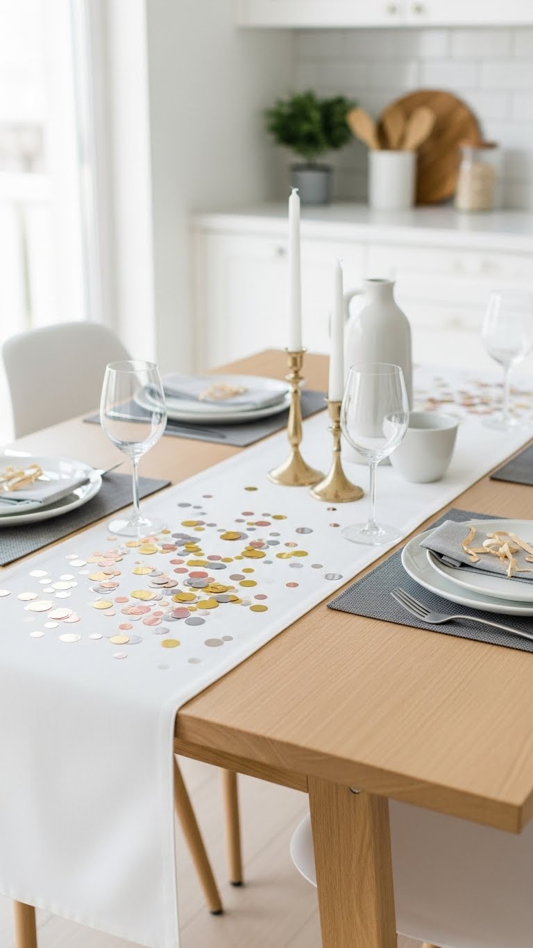 Make a confetti runner—use loose pieces on paper for $2. Lay it down. Add fun without mess tips. For a DIY, glue to fabric. Roll up after. It spices up the table.