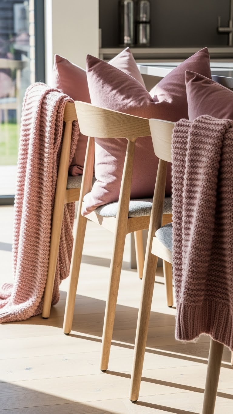 Add pink pillows to chairs—get them for $10. Drape a blanket over the back. This makes seating comfy. Layer for couples to share. For a DIY, tie a bow on existing ones. Set it up fast. Fold away when not in use. The kitchen feels like a retreat.
