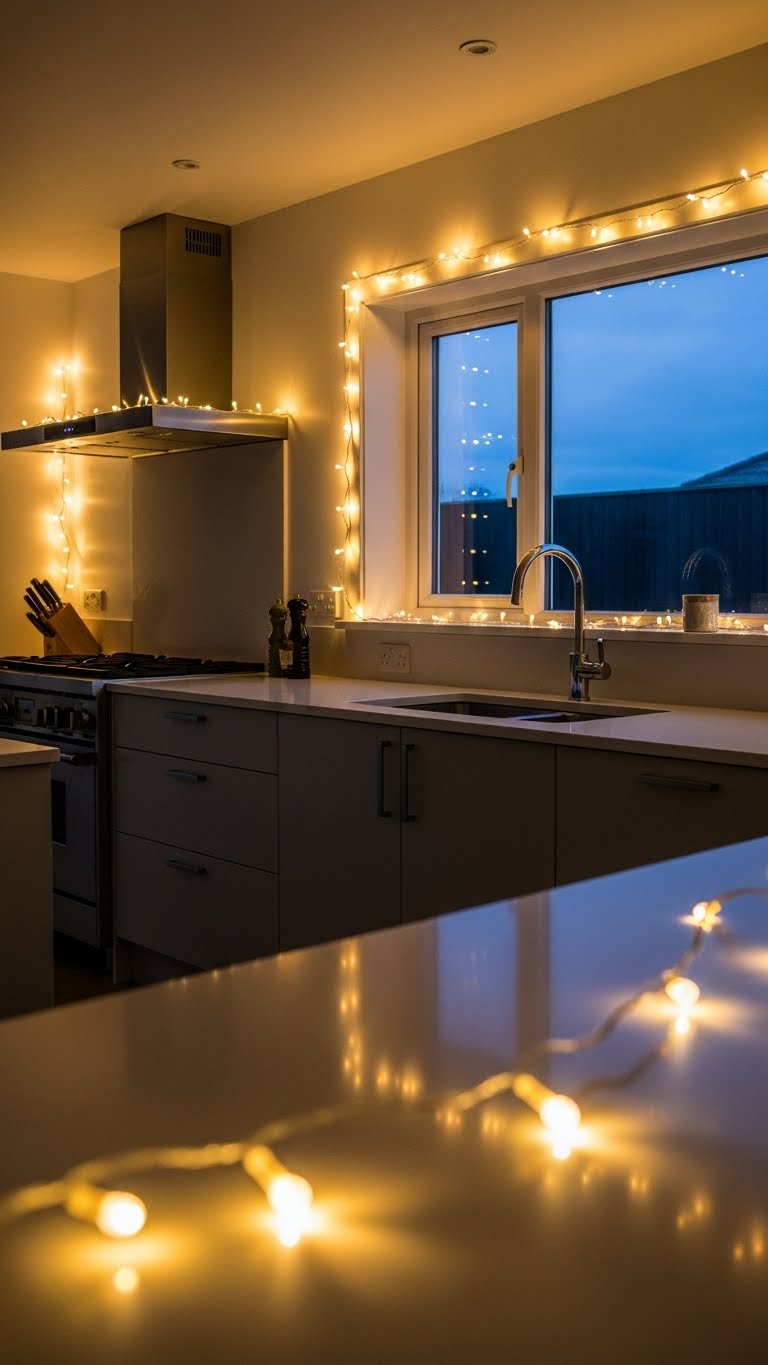 Drape string lights around your cabinets—buy a strand for $6. Plug them in and turn on. Create a cozy glow instantly. For a DIY, wrap around hooks. Adjust as needed. Unplug at night. The lights make everything magical.