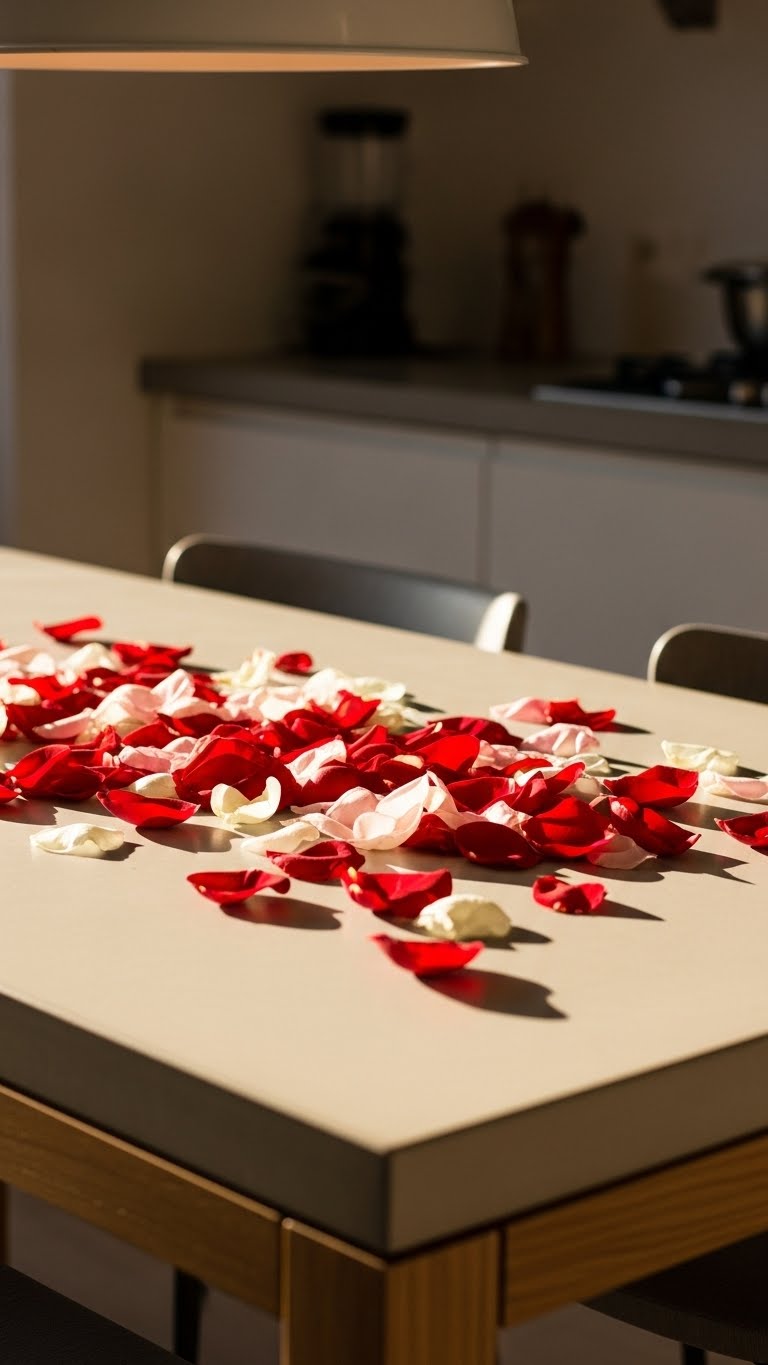 Sprinkle rose petals on your table—use a handful from a $4 pack. Keep it light to avoid mess. Mix with confetti for fun. For a DIY, use dried flowers. Spread in seconds. Sweep up later. It adds romance effortlessly.