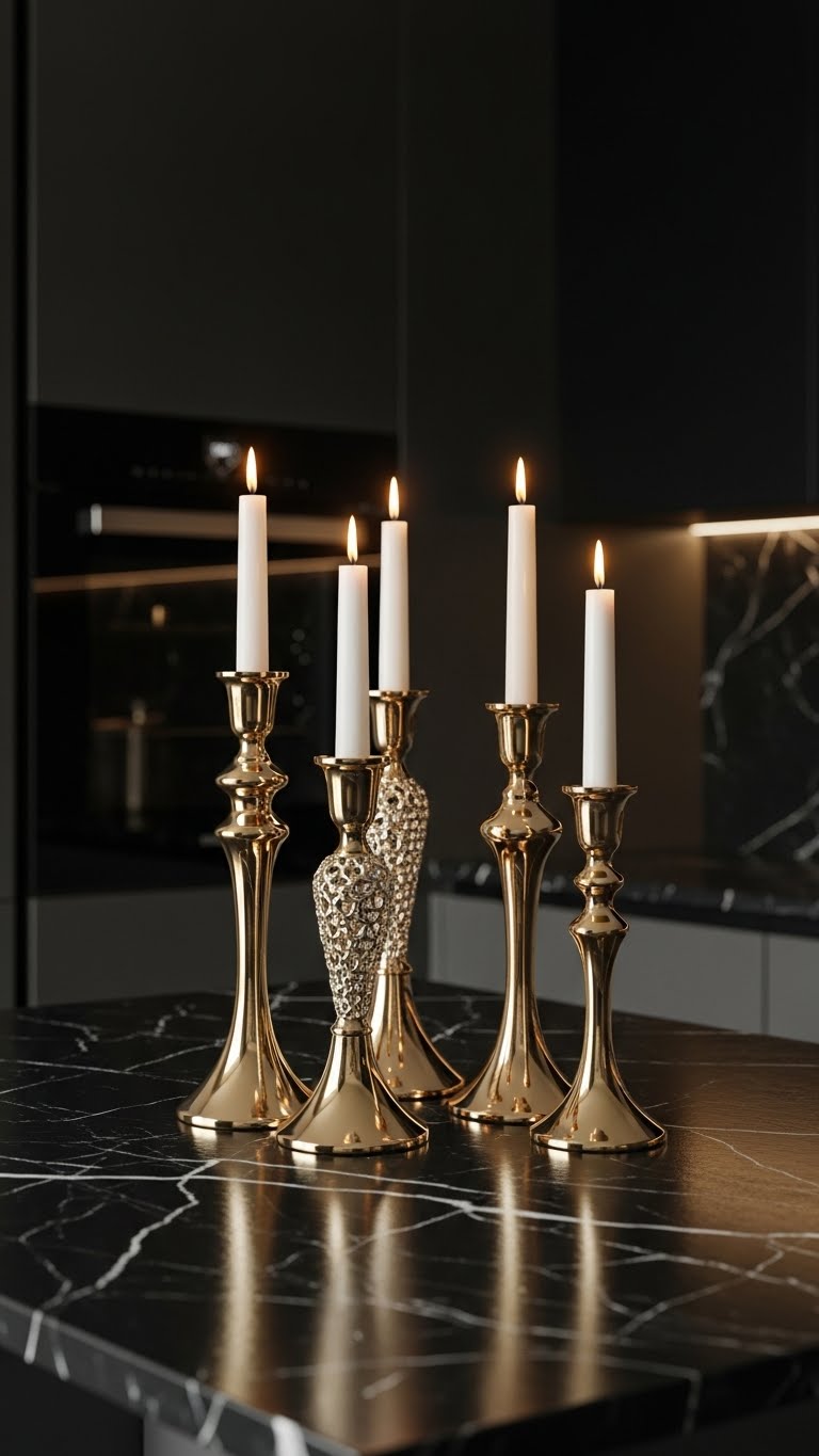 Add gold holders to your setup—buy for $5 each. Put candles inside. Bring in metallic touches without overdoing. For a DIY, wrap items in gold paper. Arrange fast. Reuse for other events. The kitchen gains a polished feel.
