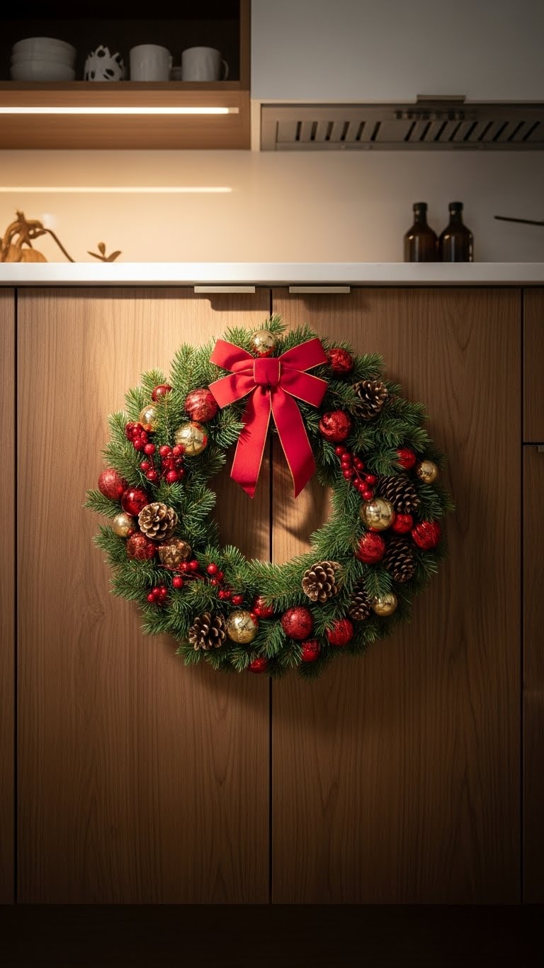 Attach a wreath to your cabinet—use one for $6. Hook it up high. Choose durable options for longevity. For a DIY, add elements to an existing one. Hang in seconds. Take down easily. It brightens the room.