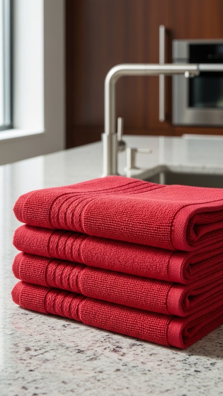 Swap in red towels—pick up for $4. Hang by the sink. Bridge function and fun daily. For a DIY, tie a bow on them. Change out quick. Launder as usual. The kitchen feels themed and practical.