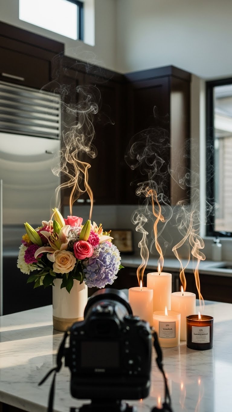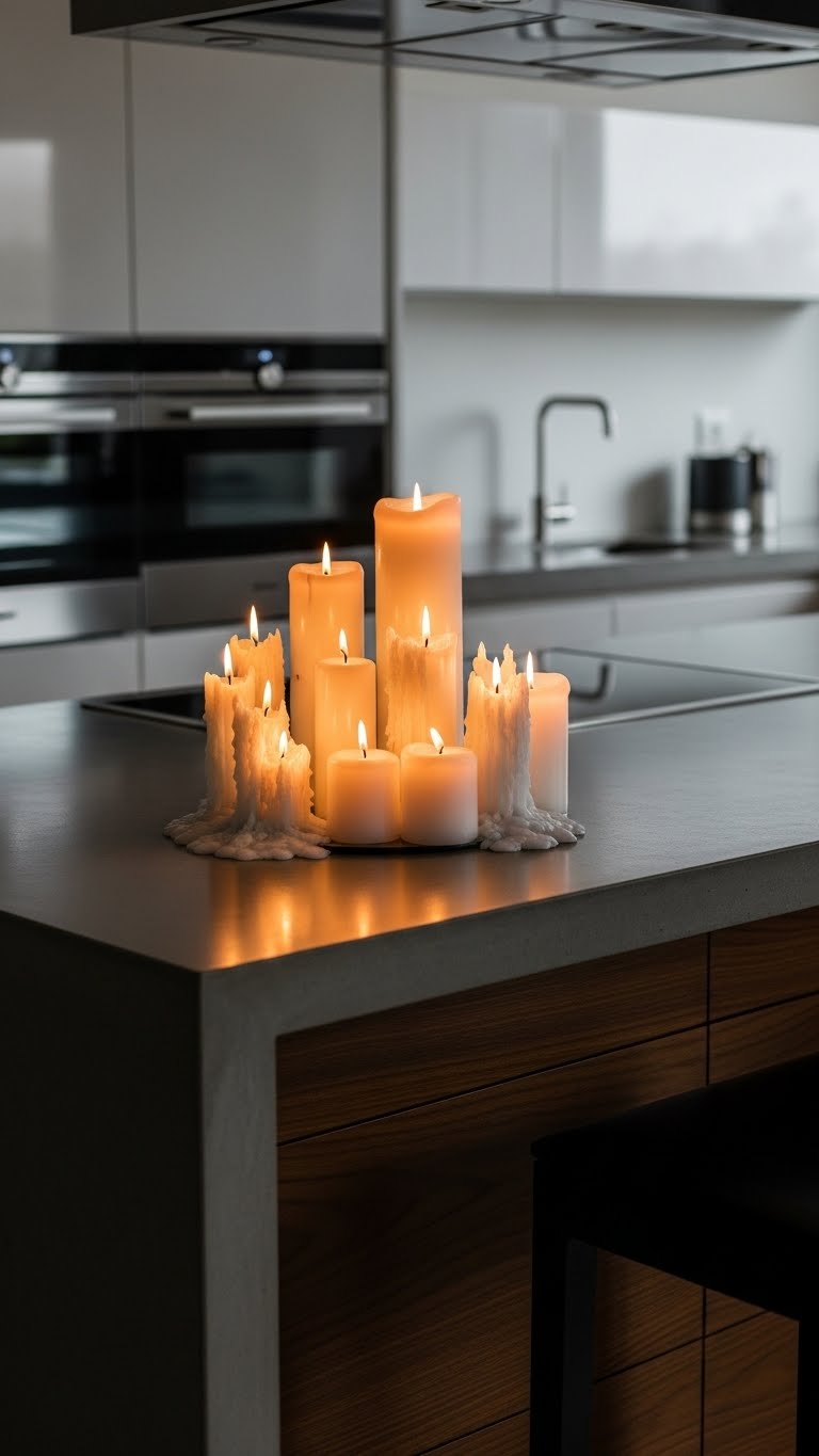 Incorporate flowers and candles for scent—use what you have. Arrange on surfaces. Enhance the feel naturally. For a DIY, group them together. Set up fast. The kitchen smells inviting.