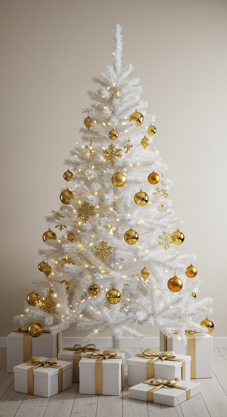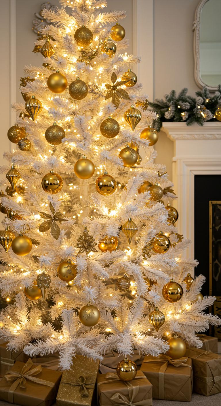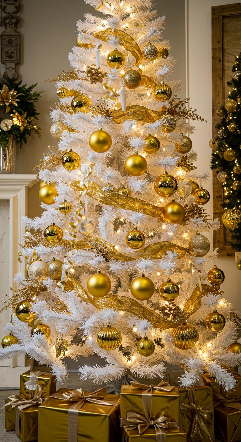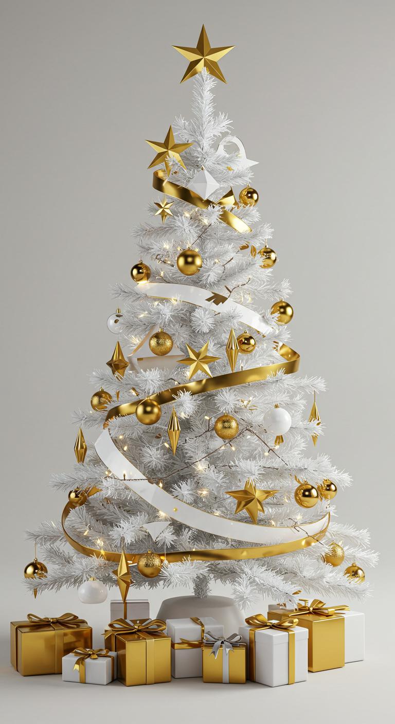 Imagine sculptural gold decorations that catch the light, creating a mesmerizing contrast with the tree’s pure white branches.