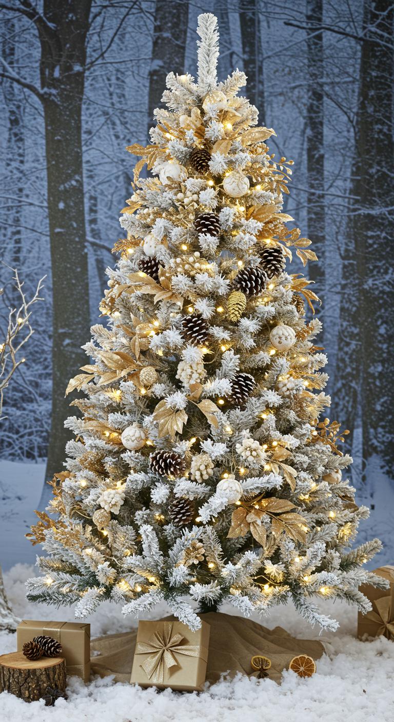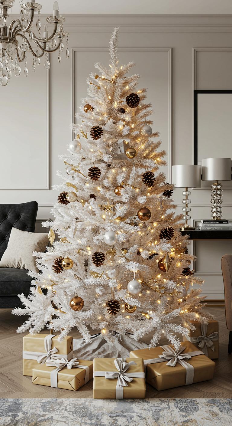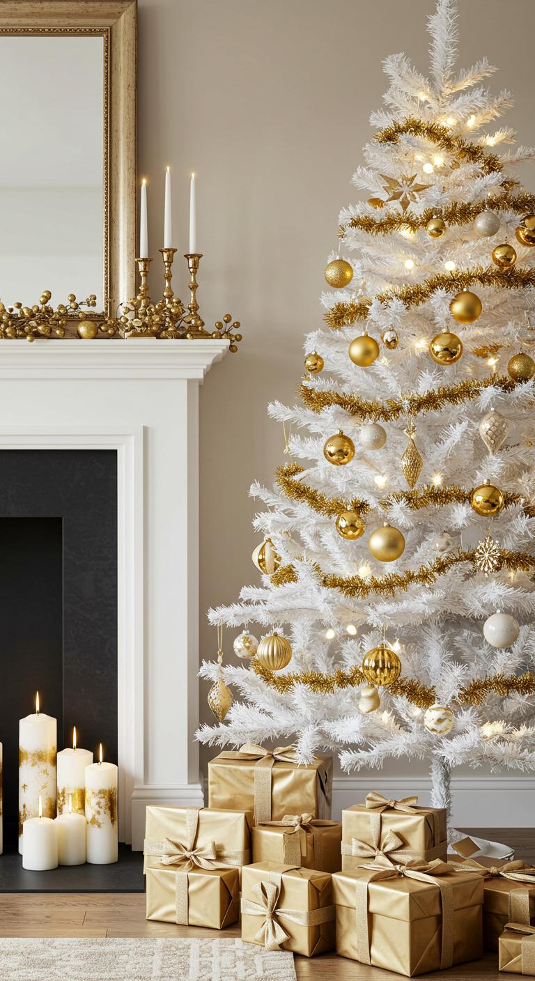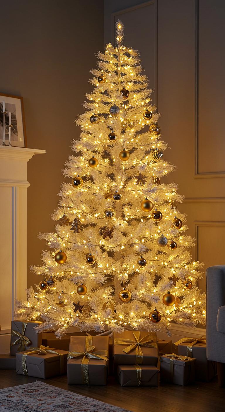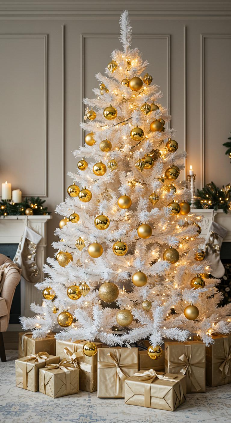 Imagine sculptural gold decorations that catch the light, creating a mesmerizing contrast with the tree’s pure white branches.