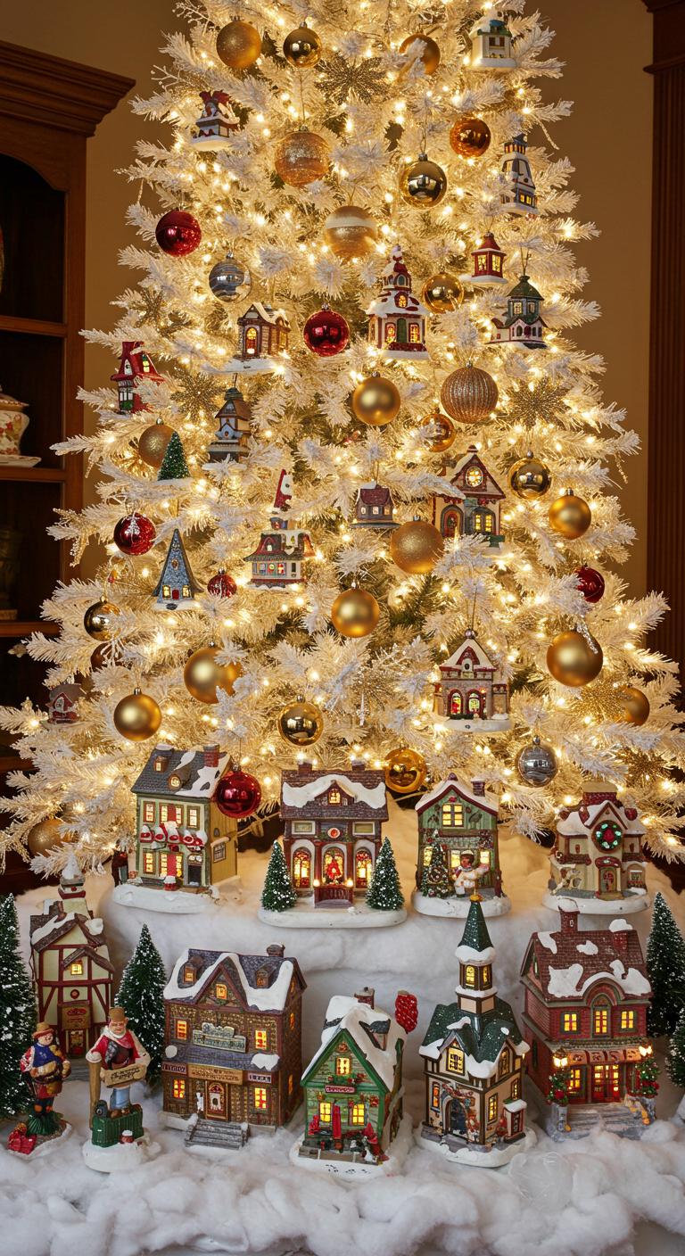 Picture a charming traditional Christmas village nestled beneath a stunning white and gold tree, where nostalgia and elegance intertwine.