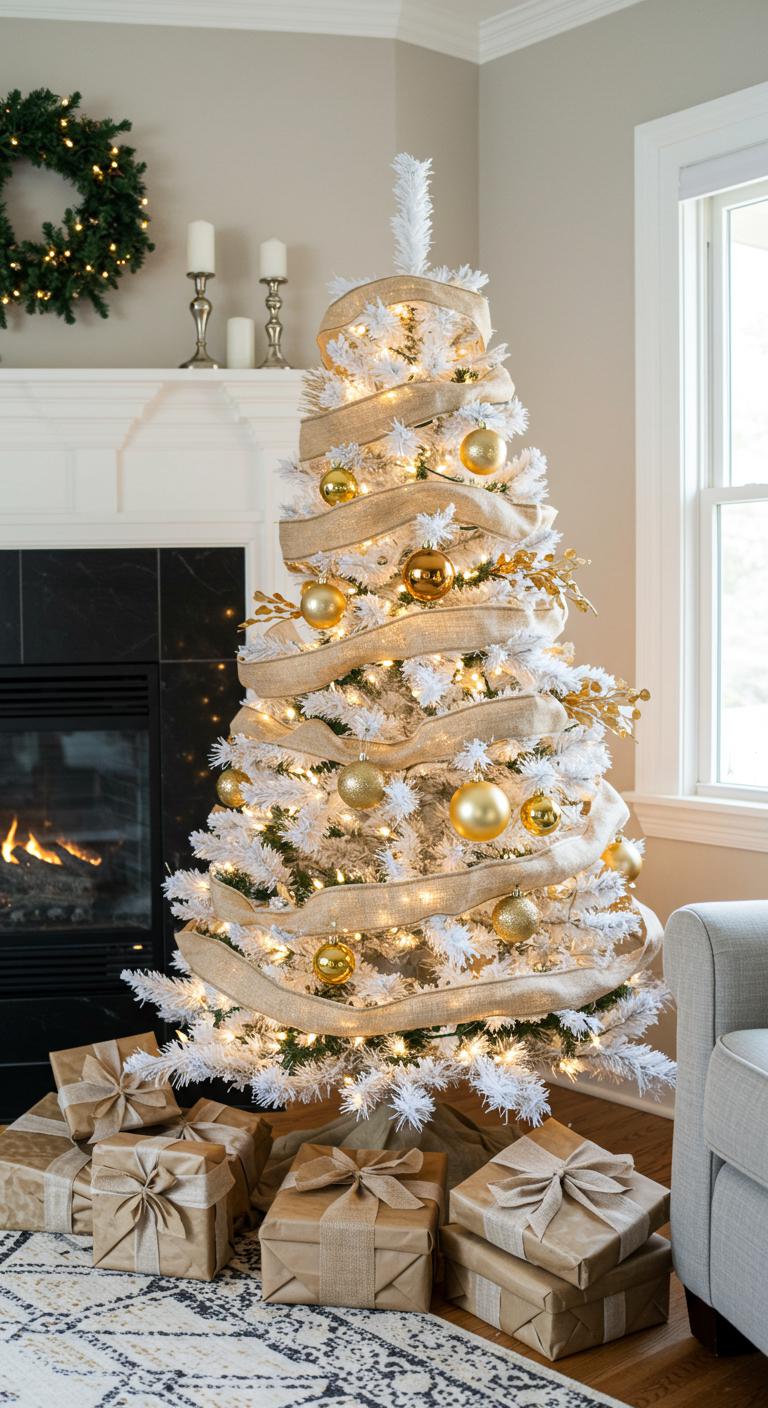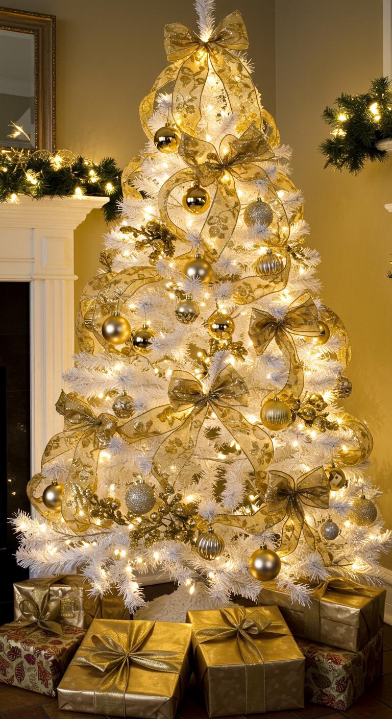 Embrace classic tree styles by using gold ribbon techniques like cascading loops or intricate bows. These ribbons add depth, creating a luxurious look that sparkles against the white branches.