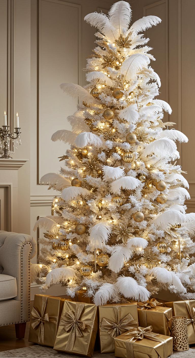 Transform your holiday setup with a glamorous white and gold feathered tree that radiates elegance and sophistication.