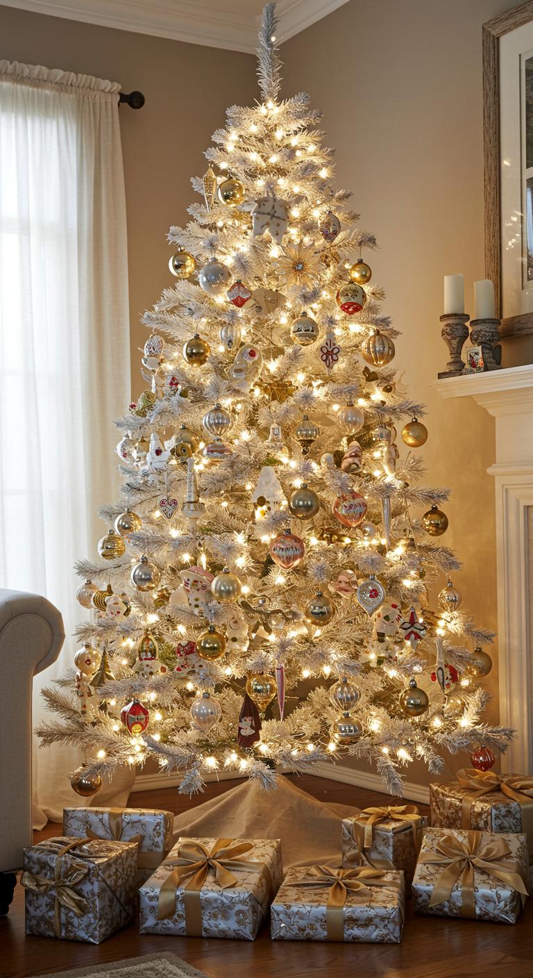 Adorn your tree with cherished vintage ornaments and delicate antique decorations, creating a warm, inviting atmosphere.