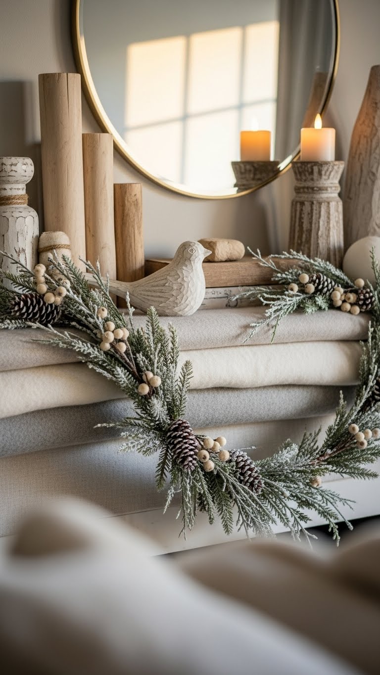 Grab some neutral throws and mix in wood pieces for a cozy feel. Start with a base of cream linens draped loosely. Add wooden beads or branches for texture. This setup works wonders for a modern twist. Try asymmetrical garlands made from twigs you find outside. It’s simple and cheap. For a DIY hack, wrap an old scarf around your mantel and tuck in pinecones from the yard. Keep costs low by shopping thrift stores for fabrics. Aim for varying heights to add interest. This method lets you reuse items year-round. Mix in a few soft pillows for extra warmth. Your space will look put-together in no time. Experiment with what you have at home first.