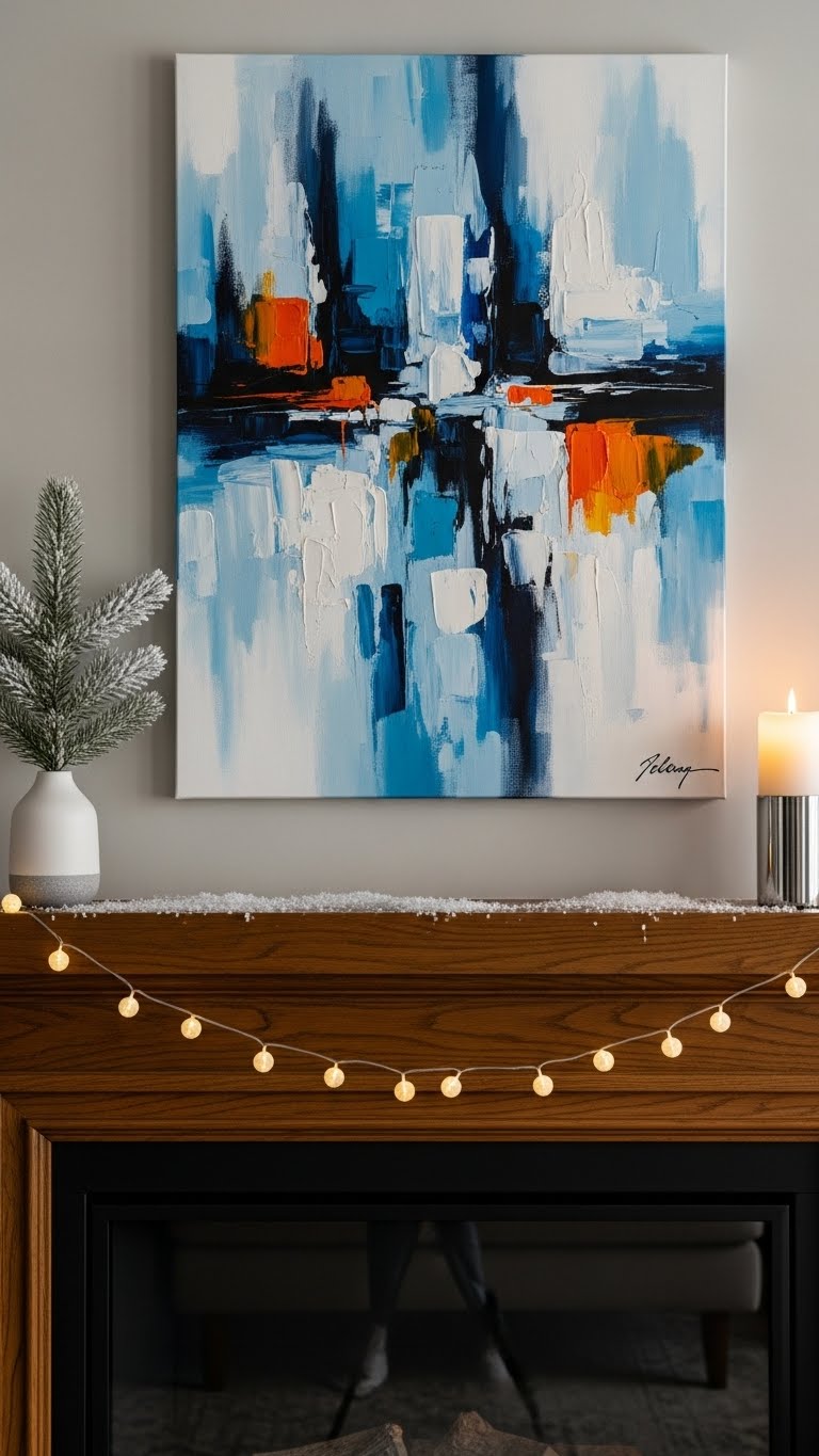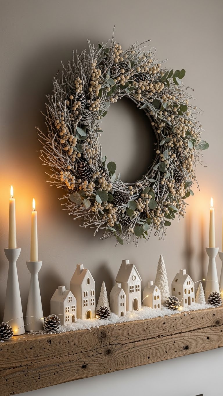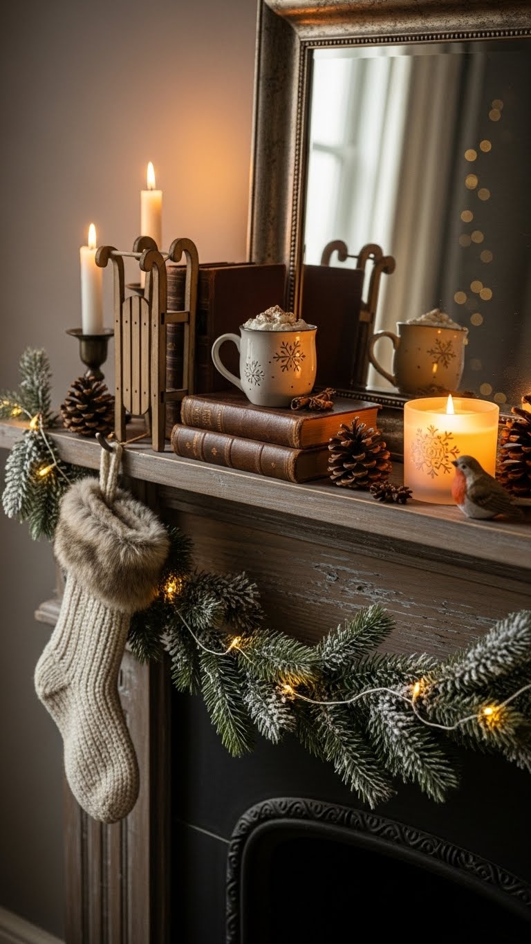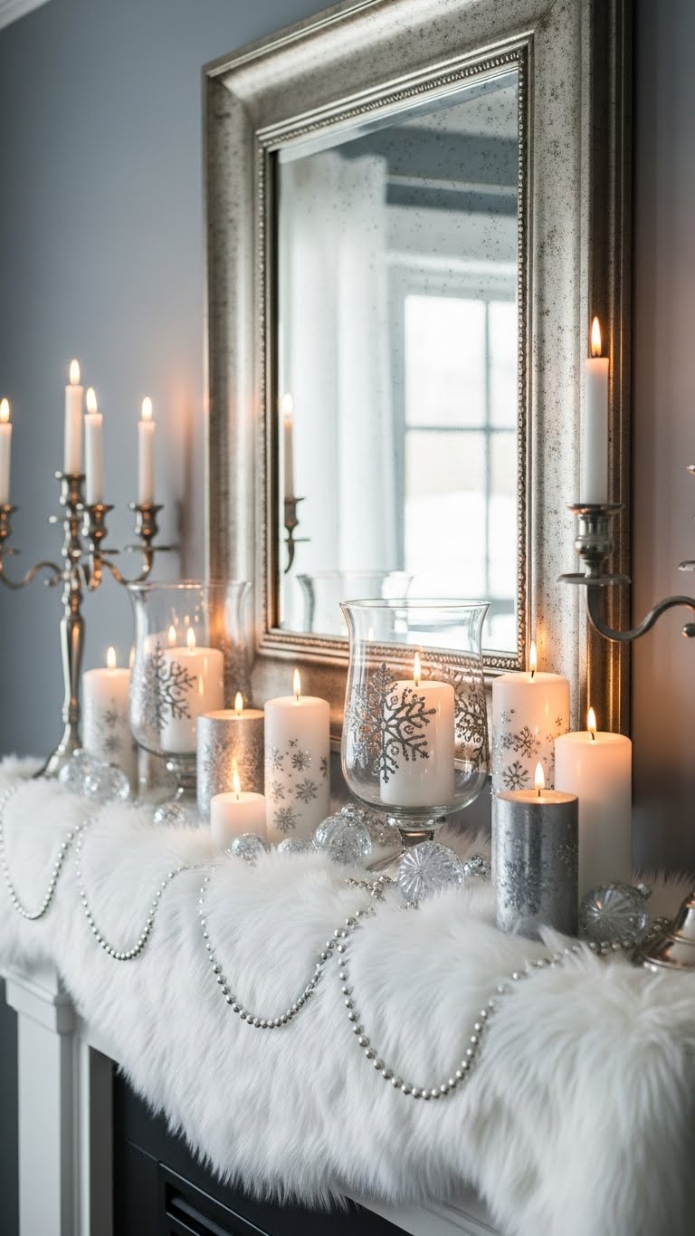 Go for white and silver to give your mantel a sleek look. Layer white linens with silver trinkets like bowls or frames. It mimics a snowy feel without fuss. For an affordable idea, use silver spray paint on household items. DIY by adding fake snow to white branches from your yard. Arrange them sparingly for elegance. This style fits any room and is simple to change. Stick to 2-3 pieces to avoid clutter. You’ll create a sophisticated vibe quickly. Test with what you have on hand. It’s a timeless way to decorate.