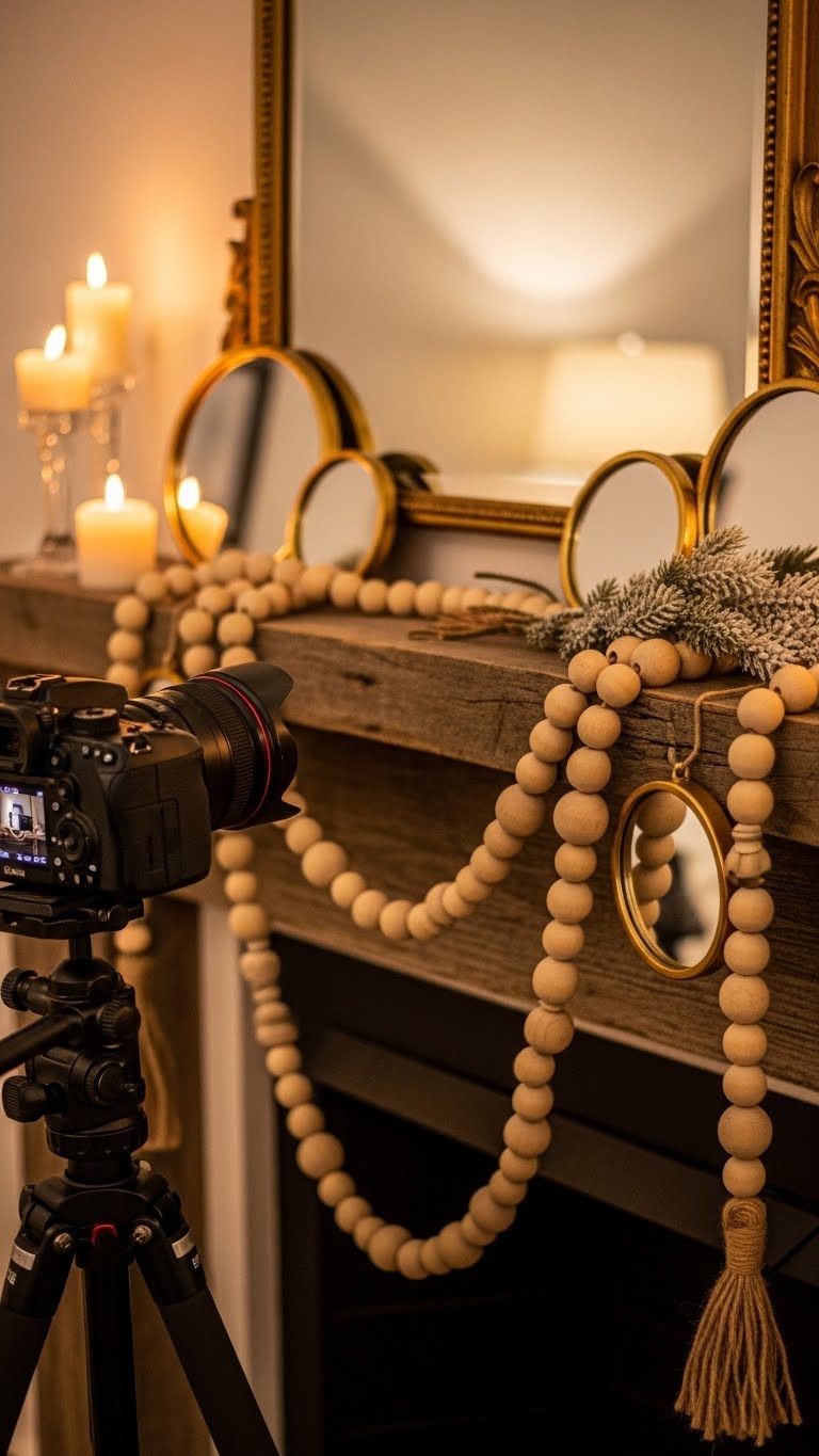 Combine wood elements with gold touches for a balanced feel. Start with wood beads on a string. Add a gold mirror as a focal point. This mix brings warmth to modern spaces. For budget savings, find wood scraps at a craft store. DIY by gluing beads onto an old garland. Hang it unevenly for interest. Use gold foil paper on frames if you lack mirrors. Keep the setup clean and reusable. Add one gold item to your existing decor. It updates your mantel affordably. Play around with placement.