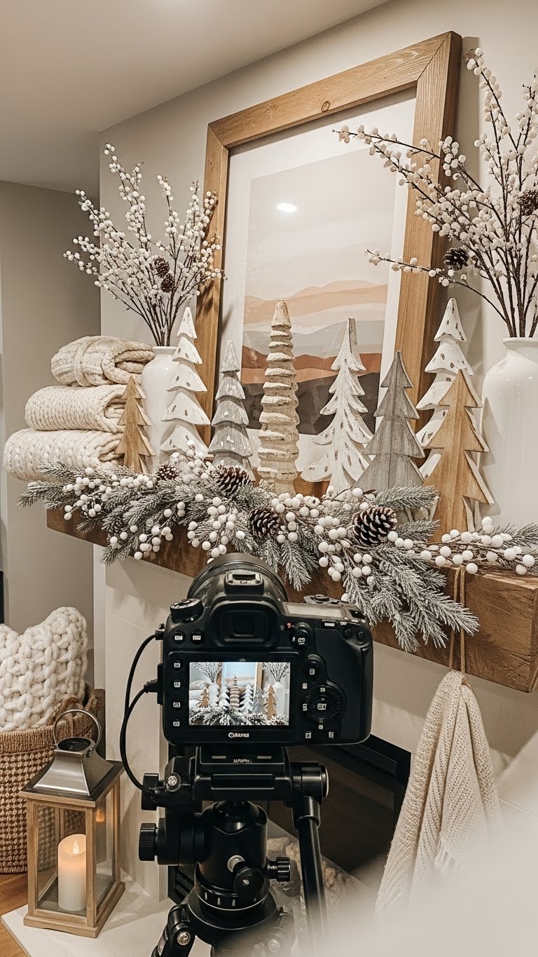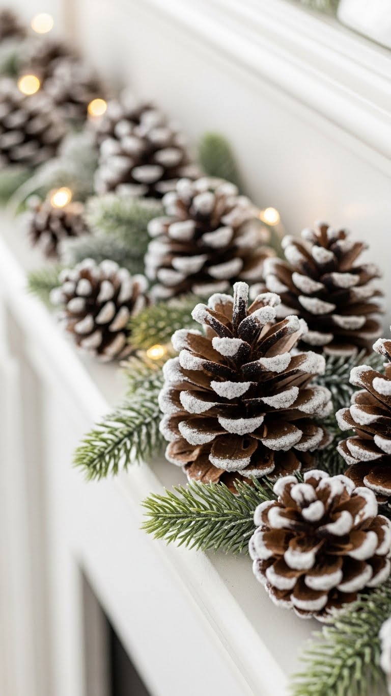 Bring in pinecones and twigs for a whimsical touch. Scatter them along your mantel for nature vibes. They’re perfect for modern winter themes. For savings, collect pinecones during a walk. DIY by spraying them with clear sealant for shine. Group them with other naturals like branches. This keeps things fresh and affordable. Use what you find outside to cut costs. Add them to your existing setup. It’s an easy way to refresh your display.