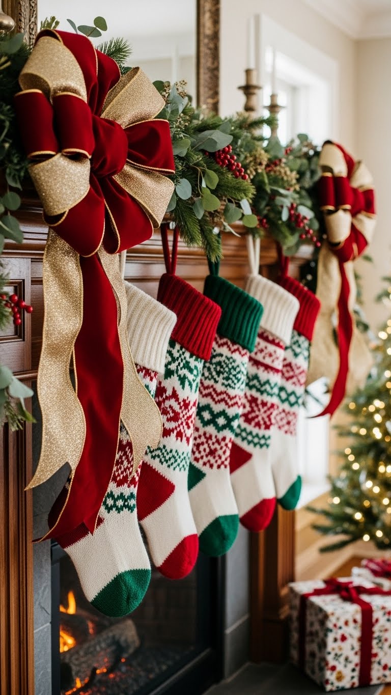 Hang bows and stockings for a festive update. Choose oversized ones in modern fabrics. Drape them along your mantel edge. This brings personality to the space. For cheap ideas, make bows from old scarves. DIY stockings from felt sheets at the store. Add them to hooks you have. Keep the number low for balance. It’s a quick way to decorate. Use what you have on hand.