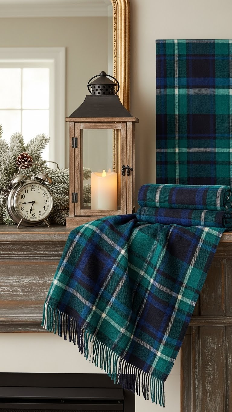 Incorporate plaid in blue or green for a bold base. Drape a plaid throw over your mantel. It coordinates with your furniture easily. For savings, buy plaid fabric remnants. DIY pillows from them. Add one piece to your setup. This adds color without overwhelming.