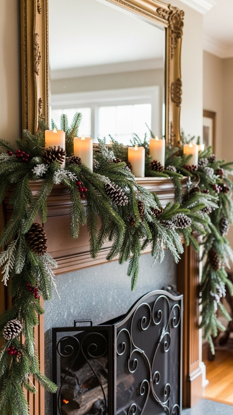 Tuck in evergreen branches for subtle warmth. Use a few to avoid clutter. They add a fresh, natural element. For a low-cost tip, clip branches from outside. DIY by trimming them to fit. Arrange them in a vase on your mantel. This creates a welcoming vibe. Keep it simple and green. It’s perfect for modern styles.