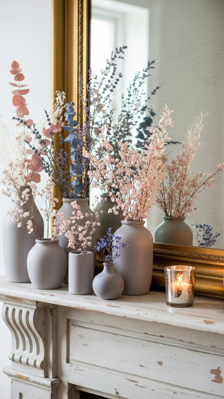 Add geometric vases for a modern edge. Fill them with dried sprigs. This updates your display quickly. For savings, find vases at thrift shops. DIY by arranging flowers inside. Place one or two on your mantel. It’s sleek and easy.