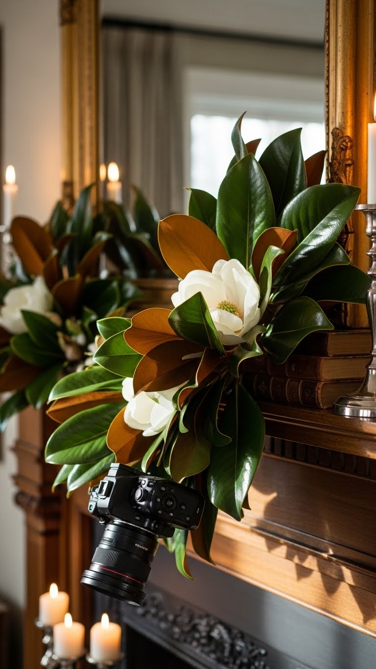Add a magnolia wreath for rustic balance. It brings in greenery without overload. For budget tips, find branches outside. DIY by forming a circle. Hang it neatly. It’s a classic choice.