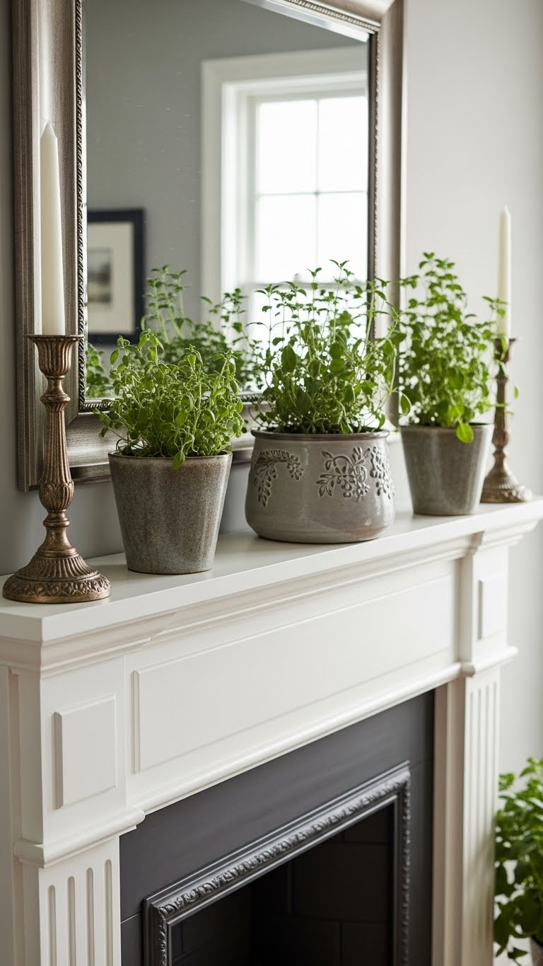 Place potted herbs for a fresh scent. Use mint or rosemary. This adds aroma to your display. For savings, grow them from seeds. DIY pots from cans. Set them on the mantel. It’s practical and nice.