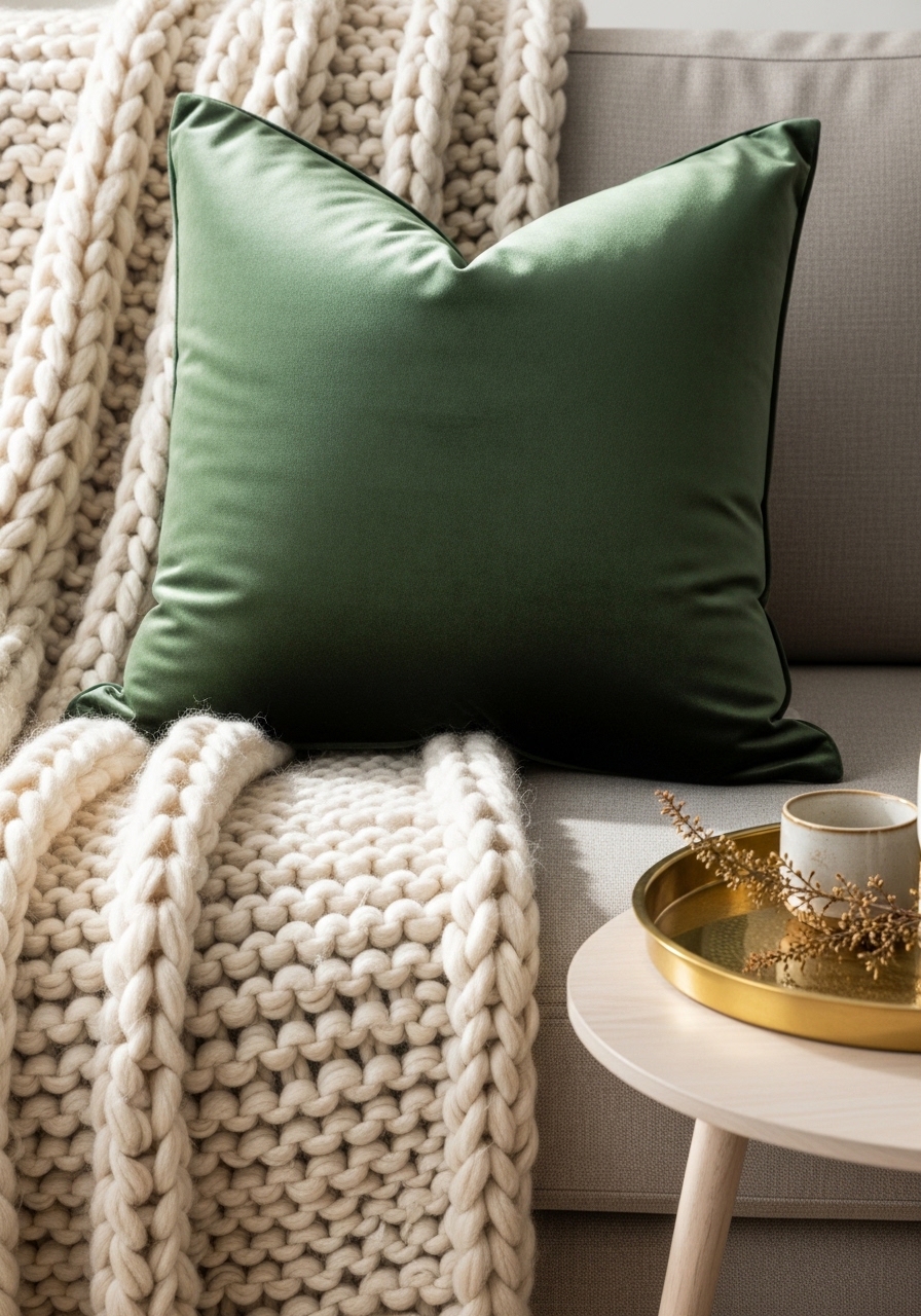 I used a base of warm neutrals—linen curtains and a jute rug—then added one bold accent: emerald velvet pillows. The contrast makes the room feel moody and intentional. I mixed textures at a 2:1 ratio (two soft textiles to one hard surface). I recommend velvet pillow covers in jewel tones. Avoid too many patterns; one bold color reads cleaner in photos and real life.