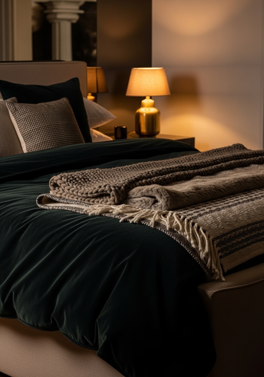 A velvet duvet or headboard adds depth without busy patterns. I used a dark charcoal duvet and mixed in velvet pillow covers in rust and navy. Velvet reads luxe on camera and in life, but avoid over-shiny finishes—they can look cheap.