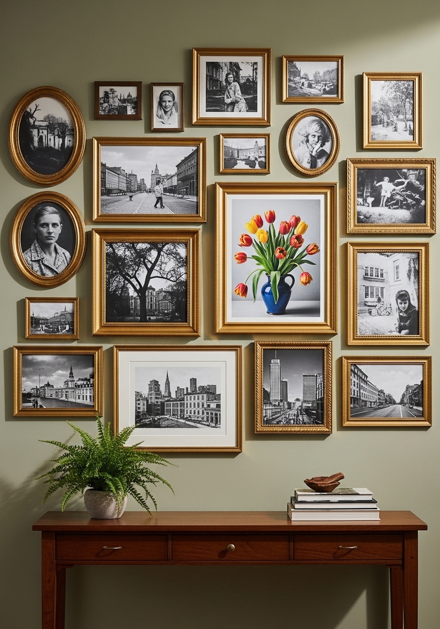 I thrifted frames, spray-painted a few matte black, and used white mats for a clean look. Arrange in odd numbers and keep the lowest frame at about 60–65 inches from the floor. Common mistake: making frames too small for the wall—scale matters.