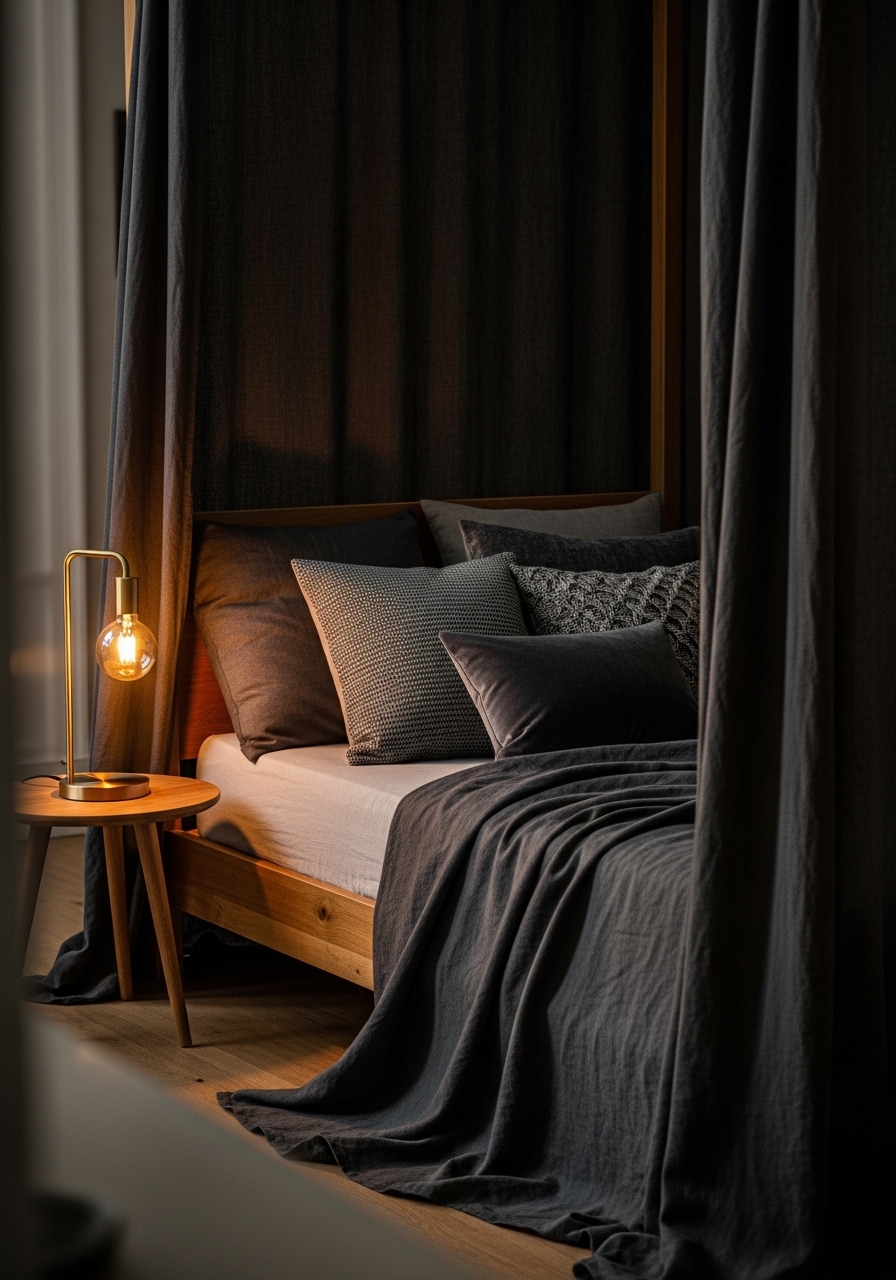 Draping dark linen over a simple canopy frame made my bedroom feel like a private retreat. I used dark linen panels for the fabric. The rule: keep one focal area moody and let surrounding walls stay neutral.