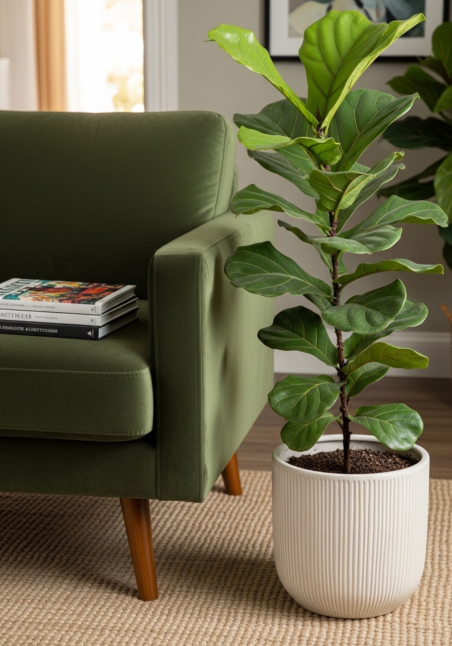 I invested in one large plant—a 6-foot fiddle leaf fig (real or faux). It creates vertical drama and softens dark walls. Real option: local nursery fiddle leaf fig. Faux option: artificial fiddle leaf fig. Tip: one statement plant beats five small ones cluttering the room.