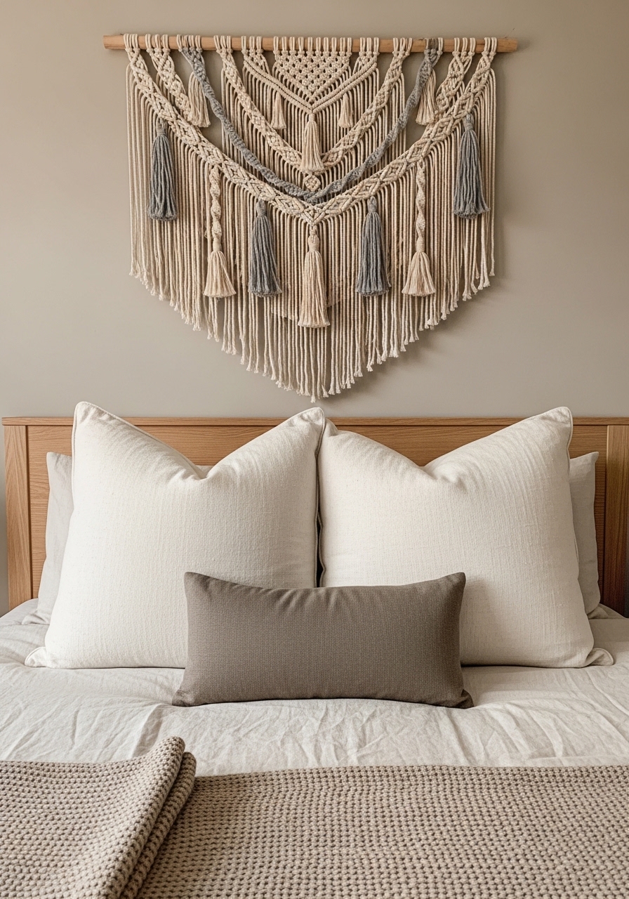 A neutral woven wall hanging adds warmth without color. I picked a piece about 30 inches wide above my bed. It reads as art and texture. Works especially well with linen bedding. Avoid overly large hangings that overwhelm small walls.