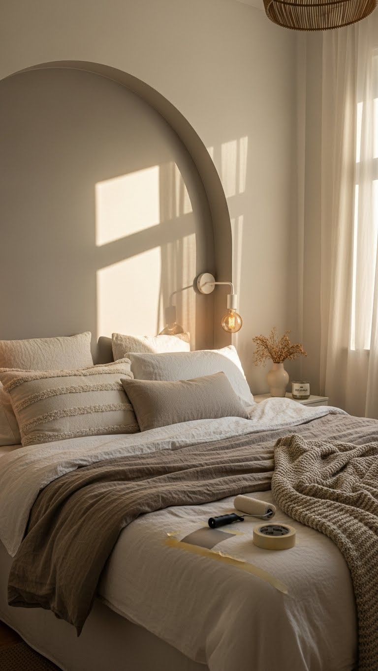 A painted neutral arch behind your bed gives the room instant character without demanding a full weekend—grab a half-day, a sample pot, a roller, and some low-tack painter’s tape and you’ll turn a plain wall into a soft focal point.
