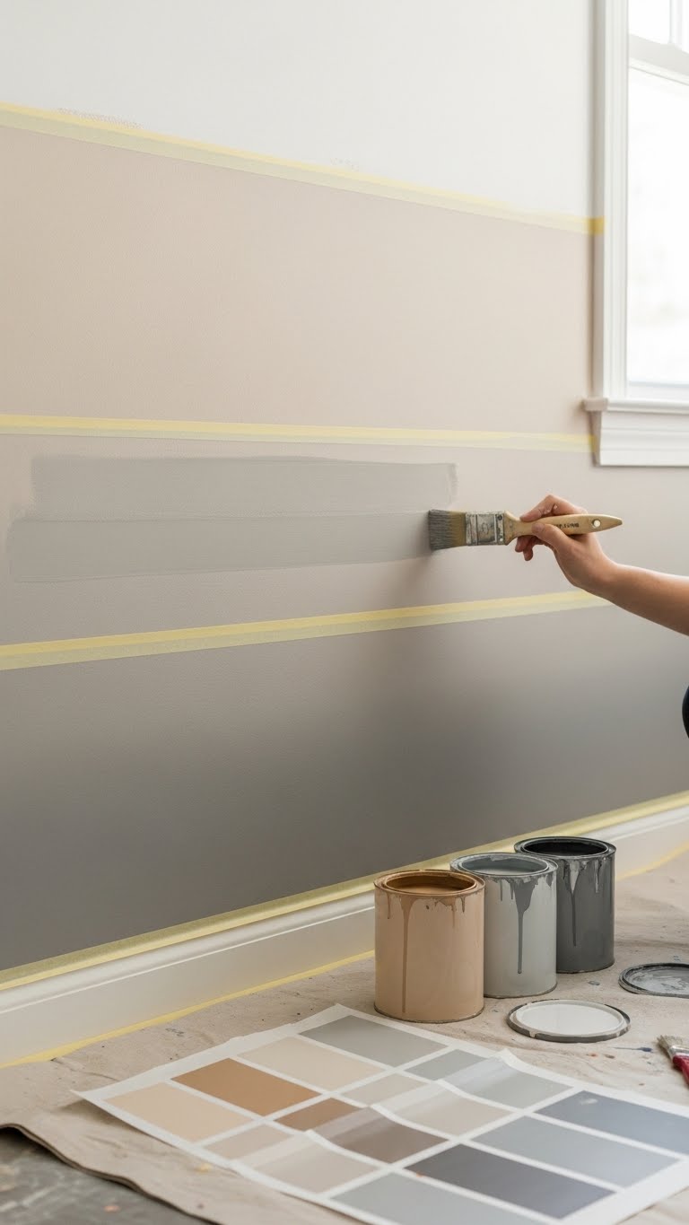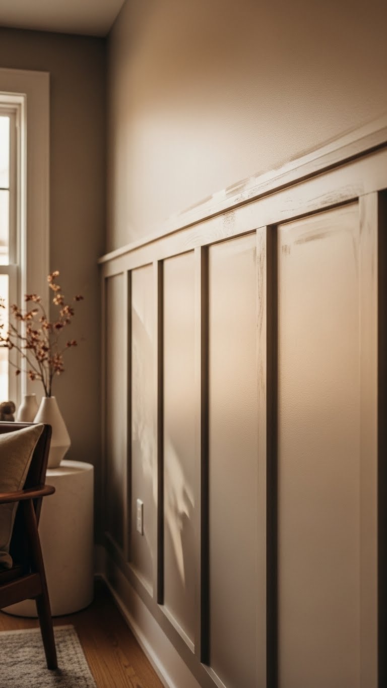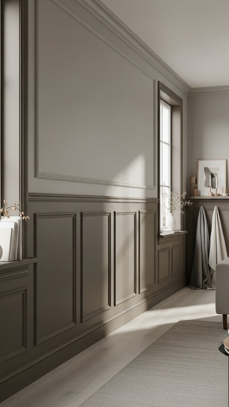 You’ll paint lower panels a deeper taupe, upper wall a soft greige, and finish with muted trim. Add linen panels or a slim shelf for warmth; the effect feels calm, open, and intentionally free.
