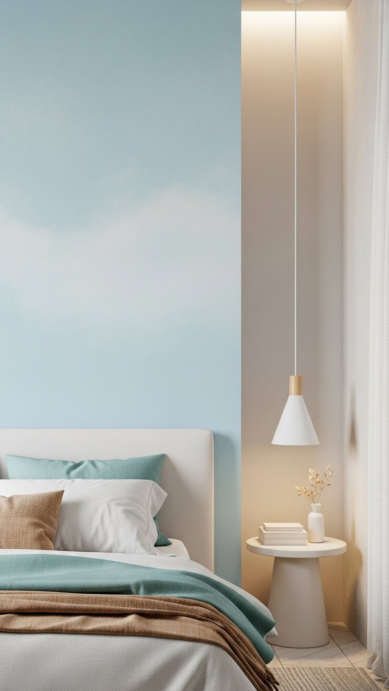 You’ll paint a pale sky mural or smooth wash, pair it with linens in a coastal calm palette, and add matte textures for depth.