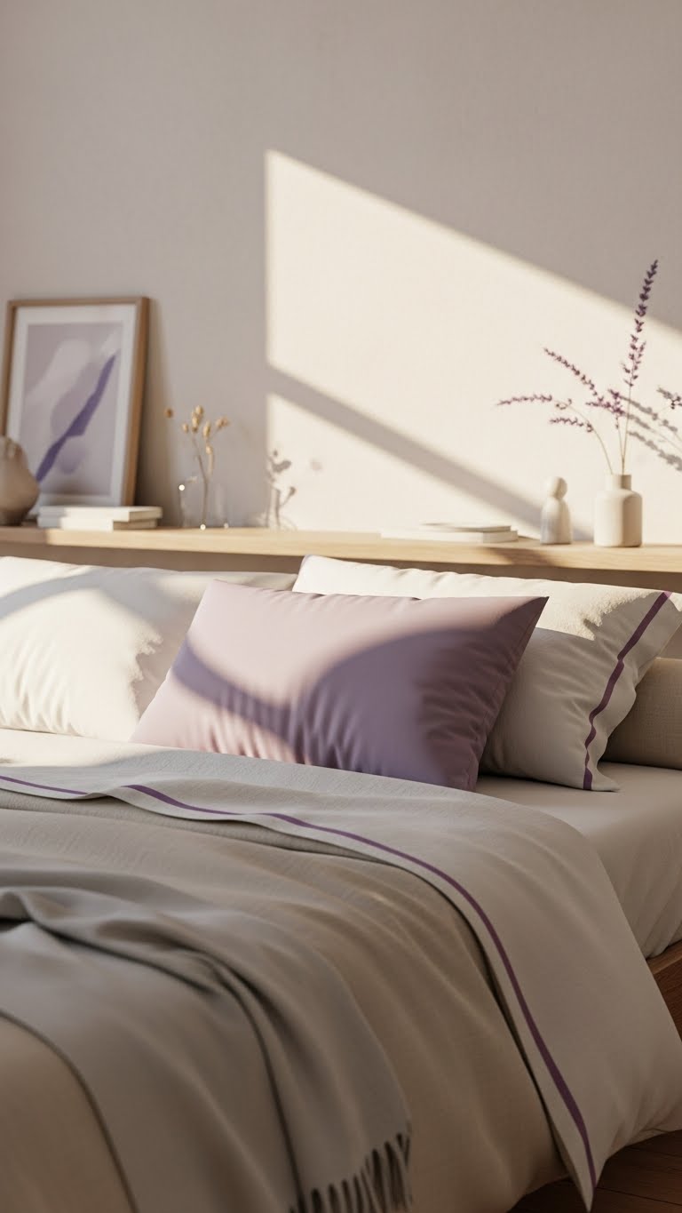 When you bring a hint of violet into a bedroom, it softens the room without overwhelming it—think whisper-thin washes on trim or a single pillow in a muted lavender. You’ll create lavender whispers that invite slow breathing; pair them with natural linens, soft light, and a low shelf for a serene vignette.