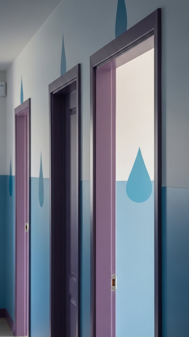 If you’ve loved the soft calm of lavender whispers in a bedroom, carry that same restraint into a hallway with teardrop blue paired against shadow purple trim.