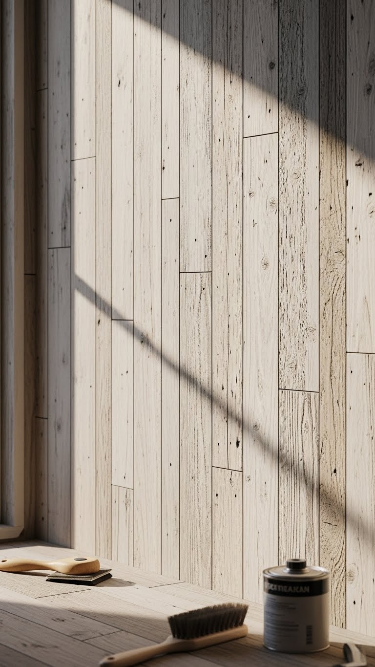 A bleached reclaimed wood plank wall brings soft, sun-washed texture to your room while celebrating age and character—you’ll sand and strip salvaged boards, apply a gentle bleaching solution, then seal to preserve the pale, driftwood tones. You’ll enjoy rustic bleaching’s earthy scent as you fit varied planks, fastening them straight and tight, then finishing with clear plank sealing for durable, free-spirited calm.