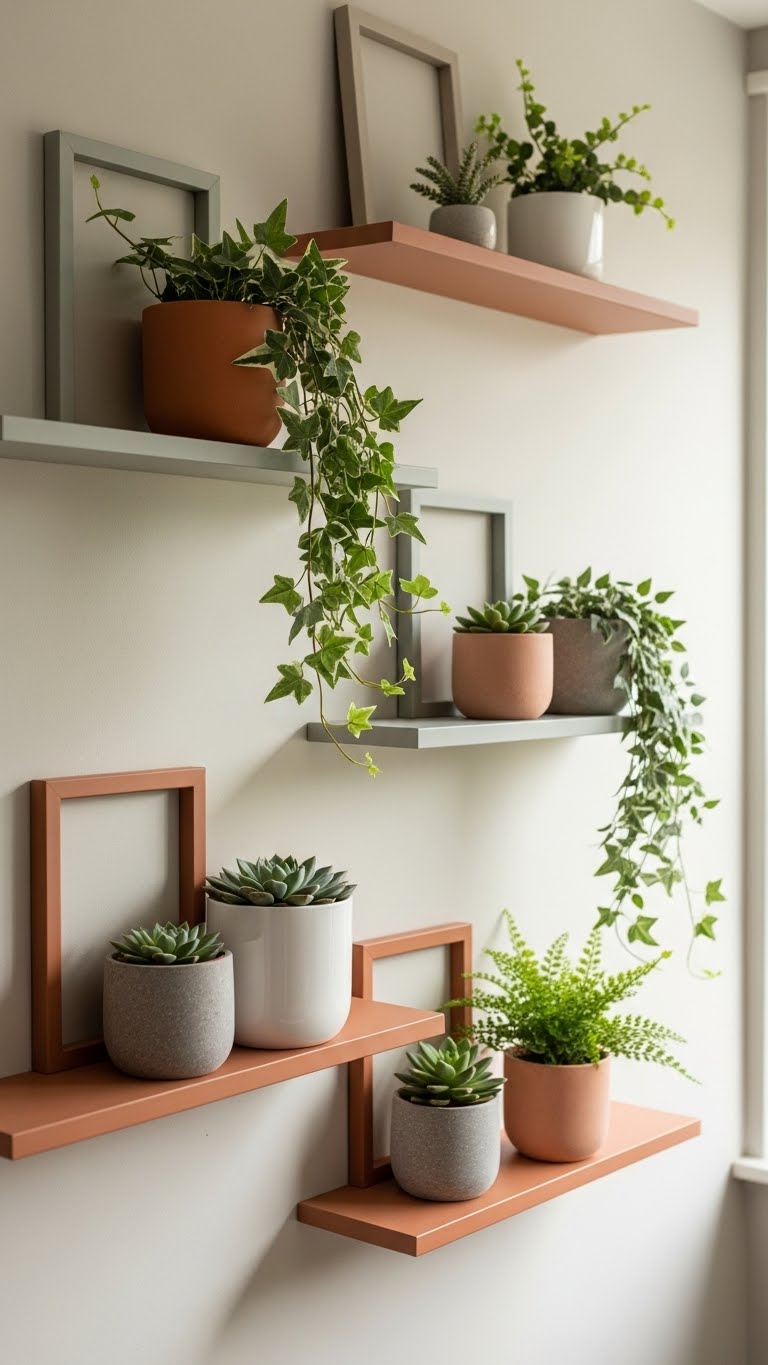 You’ll place mini planters on narrow ledges, vary staggered heights, and mix matte neutrals with terracotta warmth. It’s tactile, low-commitment, and lets you rearrange greenery whenever you crave a fresh, freer feel.