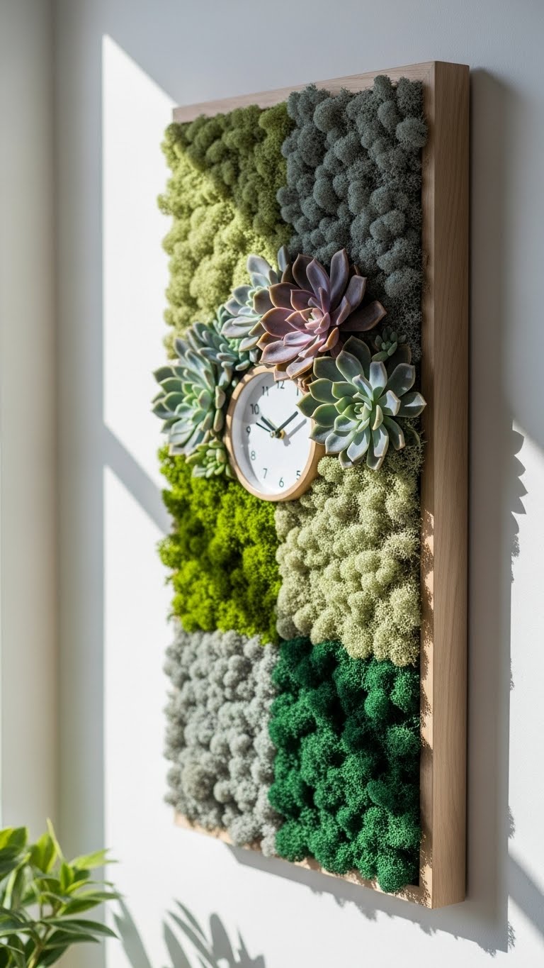 You’ll mount dried moss art or a living panel in a slim frame, arranging succulents or a quirky succulent wallclock.