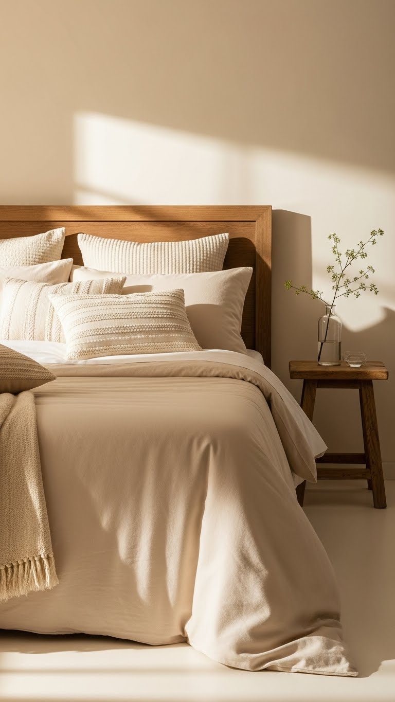 Swap linens to ivory for beds. Change them weekly. Pick durable ones. Find sales online. For DIY, dye old sheets. This keeps things fresh. Make your bed daily.