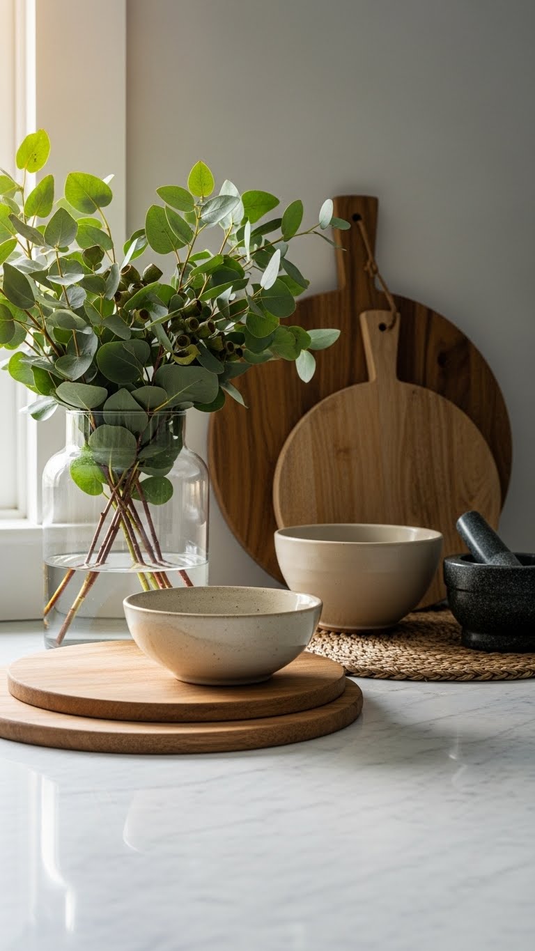 Cut eucalyptus for a vase on your counter. This adds green without effort. Buy stems for under $15. Arrange them straight for simplicity. For DIY, trim them to fit your space. Put this near windows for light. It refreshes your kitchen fast. Mix with other greens for variety. Start today and enjoy the change.