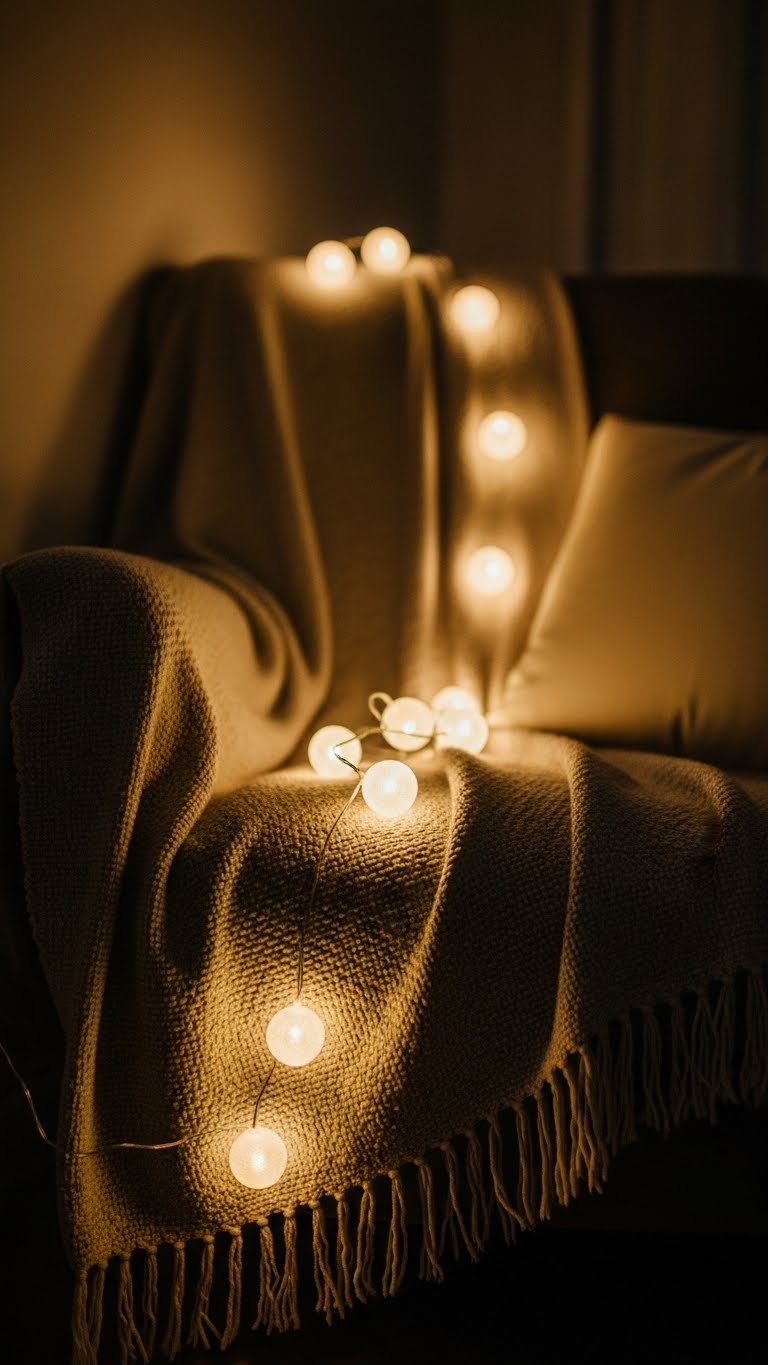Hang string lights in corners for mood. Use battery ones to avoid wiring. Drape them over furniture. Get them for $10. For DIY, wrap them around frames. Turn them on at night. This makes spaces feel intimate. Place in bedrooms for calm. Adjust as needed for comfort.