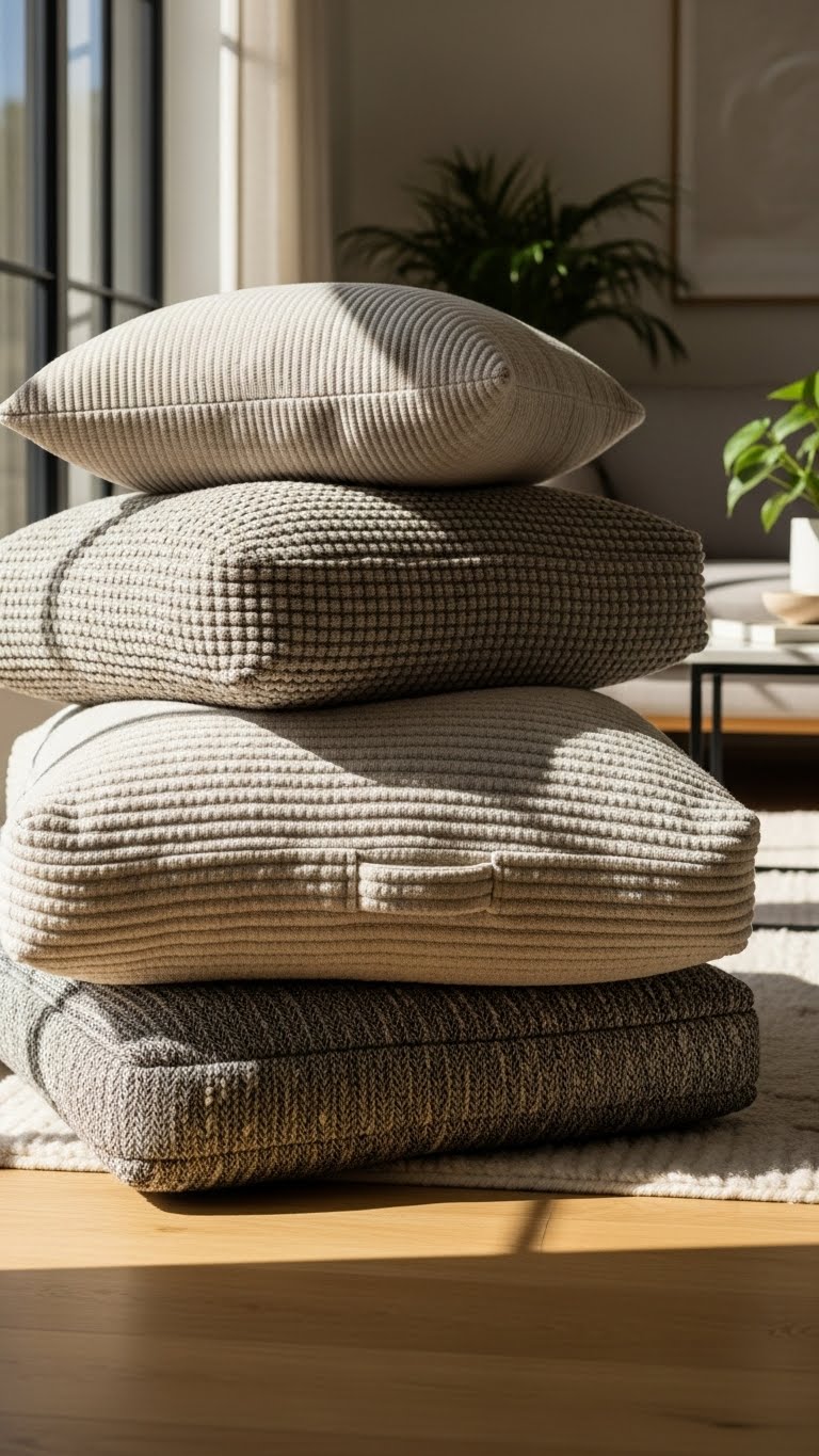 Pile floor cushions for extra seats. Choose in soft hues. Stack them in corners. Find deals online. For DIY, stuff old pillows. This adds seating easily. Use for gatherings.